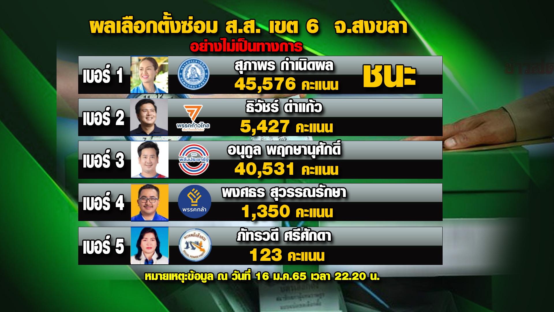• ผลการเลือกตั้ง ส.ส.สงขลา-ชุมพร