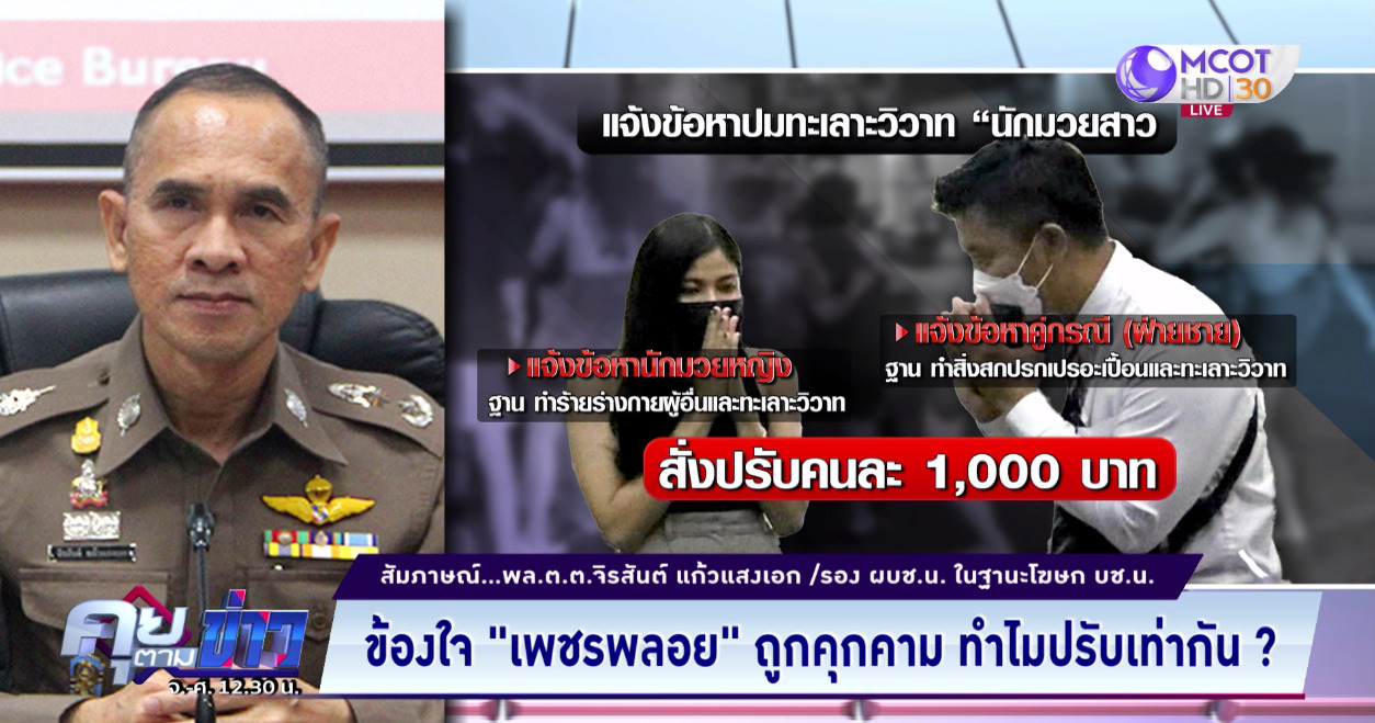- สัมภาษณ์ พล.ต.ต.จิรสันต์ แก้วแสงเอก รองผบช.น.ในฐานะ โฆษก บช.น. กรณี “แพรพลอย แซ่เอี้ย” หรือฉายา “เพชรพลอย ขวาท่อนซุง” นักมวยสาว ถูกคุกคาม หนุ่มเทน้ำราดหัวที่ไม่ยอมชนแก้ว ทำไมปรับเท่ากัน