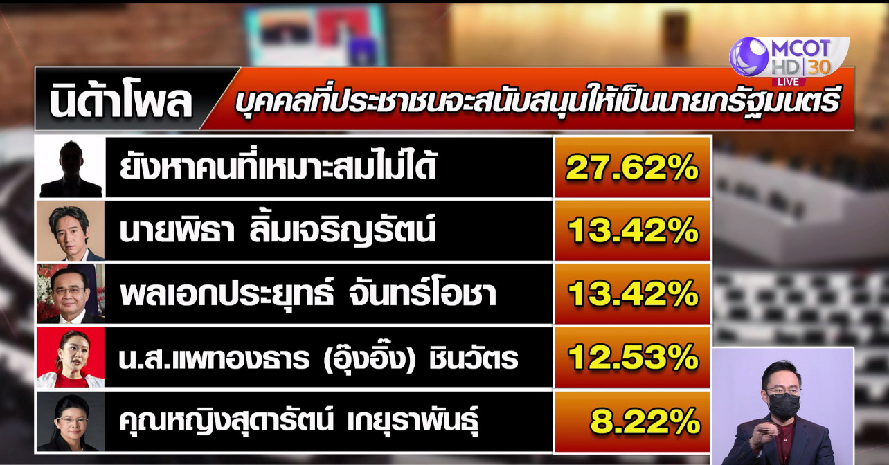 • นิด้าโพล เผยบุคคลที่ประชาชนสนับสนุนให้เป็นนายกฯ 27.62% ยังหาคนที่เหมาะไม่ได้