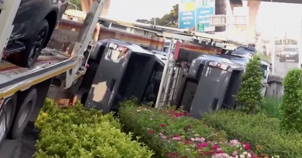 – รถพ่วงขนรถพลิกคว่ำ รถใหม่พัง 4 คัน