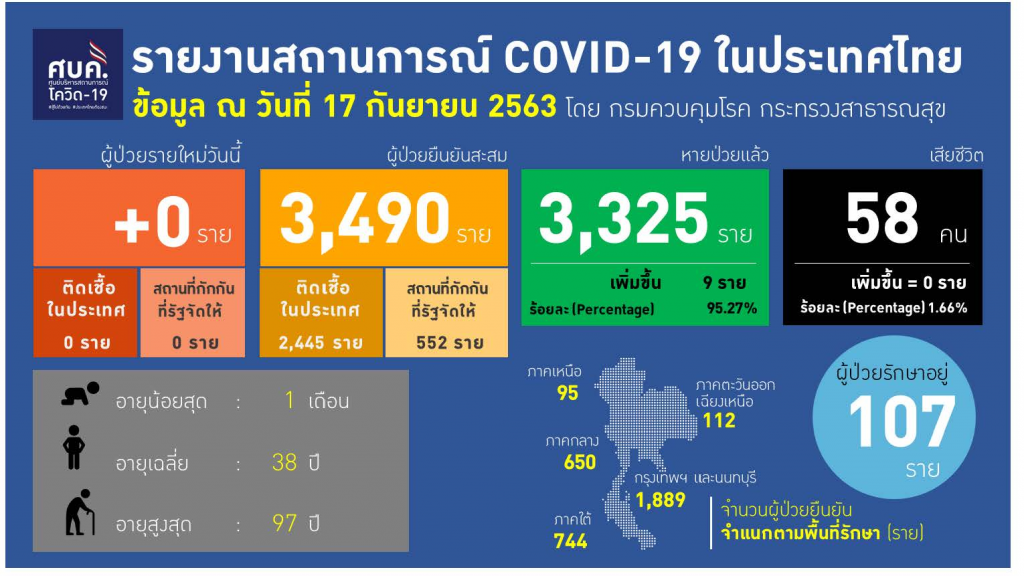 สำนักข่าวไทย 17 ก.ย. 63 – สถานการณ์การติดเชื้อ COVID-19 ประเทศไทย พบผู้ป่วยรายใหม่ 0 ราย ผู้ป่วยยืนยันสะสม 3,490 ราย หายป่วยแล้ว 3,325 ราย รักษาในโรงพยาบาล 107 ราย เสียชีวิตสะสม 58 ราย