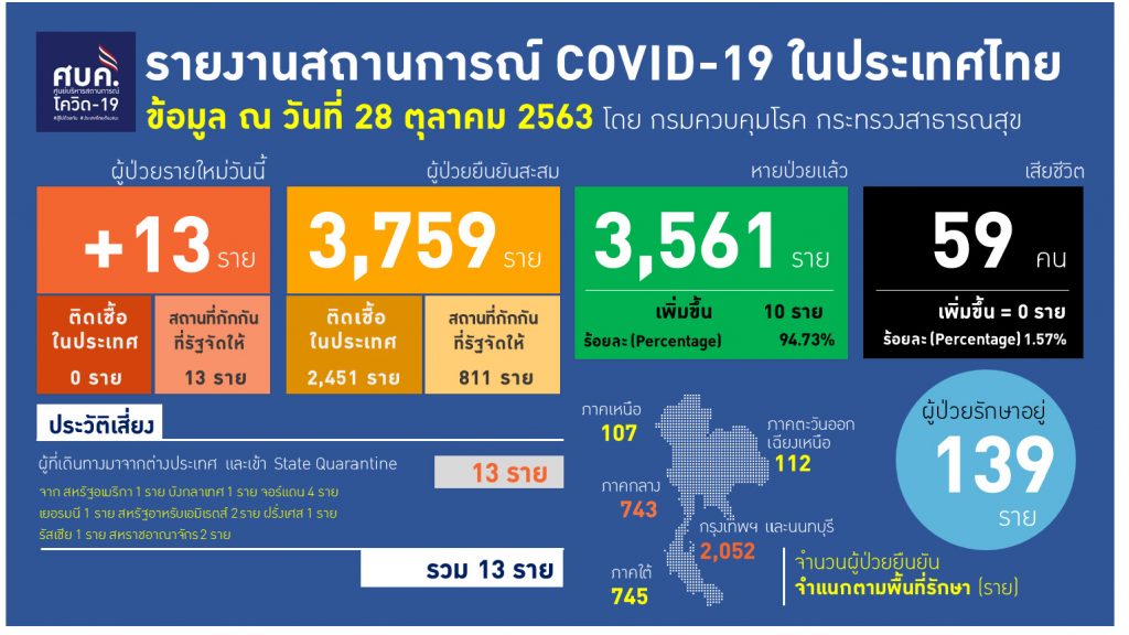 สำนักข่าวไทย 28 ต.ค.- สถานการณ์การติดเชื้อ COVID-19 ประเทศไทย พบผู้ป่วยรายใหม่ 13 ราย ผู้ป่วยยืนยันสะสม 3,759 ราย หายป่วยแล้ว 3,561 ราย เสียชีวิตสะสม 59 ราย