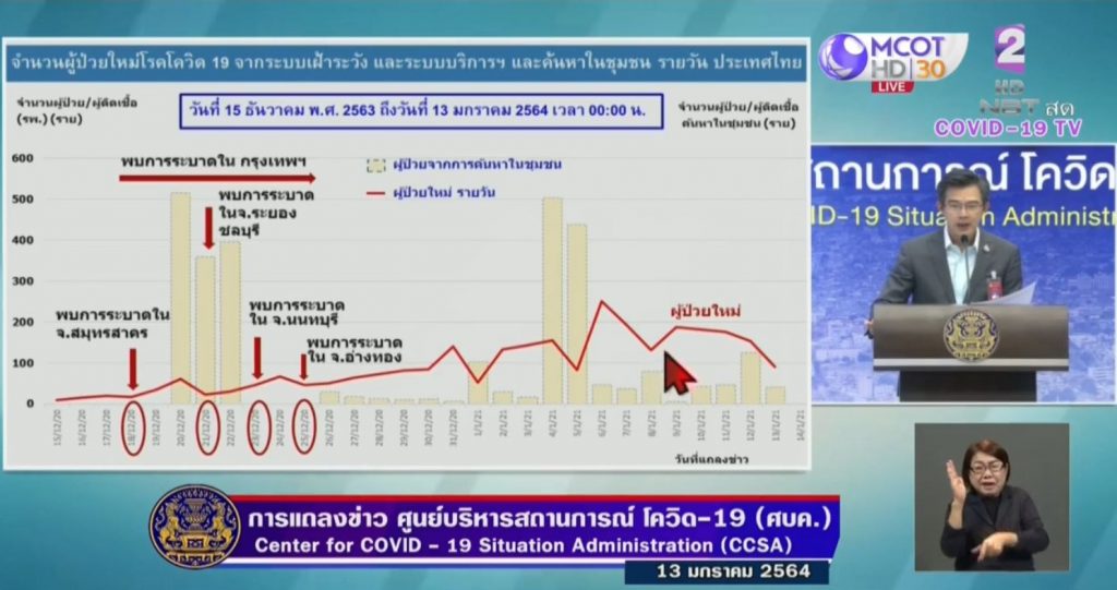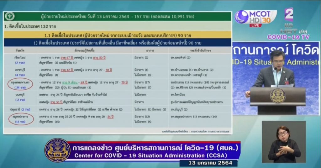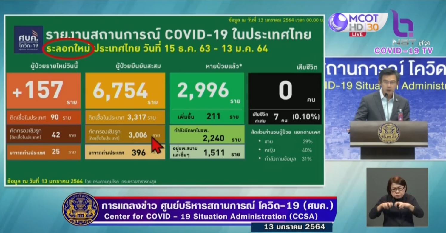 กทม. 13 ม.ค. – ศูนย์ข้อมูล COVID-19 รายงานสถานการณ์การติดเชื้อ COVID-19 ในประเทศไทย วันพุธที่ 13 มกราคม 2564 พบผู้ป่วยรายใหม่ 157 ราย ผู้ป่วยยืนยันสะสม 10,991 ราย รักษาหายเพิ่ม 211 ราย หายป่วยแล้ว 6,943 ราย ยังรักษาตัวอยู่ในโรงพยาบาล 3,981 ราย เสียชีวิตสะสมคงที่ 67 ราย