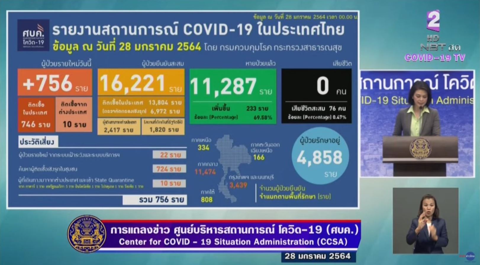 กทม. 28 ม.ค. – ศูนย์ข้อมูล COVID-19 รายงานสถานการณ์การติดเชื้อ COVID-19 ในประเทศ วันพฤหัสบดีที่ 28 มกราคม 2564 พบผู้ป่วยรายใหม่ 756 ราย ผู้ป่วยยืนยันสะสม 16,221 ราย รักษาหายเพิ่ม 233 ราย หายป่วยแล้ว 11,287 ราย ยังรักษาตัวอยู่ในโรงพยาบาล 4,858 ราย เสียชีวิตสะสม 76 ราย