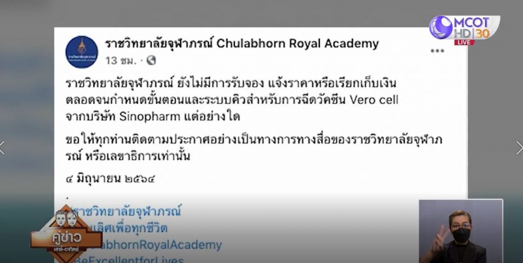 เพจเฟซบุ๊ก “ราชวิทยาลัยจุฬาภรณ์ Chulabhorn Royal Academy” โพสต์ข้อความความคืบหน้ากรณีวัคซีนซิโนฟาร์ม ระบุว่า ราชวิทยาลัยจุฬาภรณ์ยังไม่มีการรับจอง แจ้งราคาหรือเรียกเก็บเงิน ตลอดจนกำหนดขั้นตอนและระบบคิวสำหรับการฉีดวัคซีน Vero cell จากบริษัท Sinopharm แต่อย่างใด ขอให้ทุกท่านติดตามประกาศอย่างเป็นทางการทางสื่อของราชวิทยาลัยจุฬาภรณ์ หรือเลขาธิการเท่านั้น 4 มิถุนายน 2564