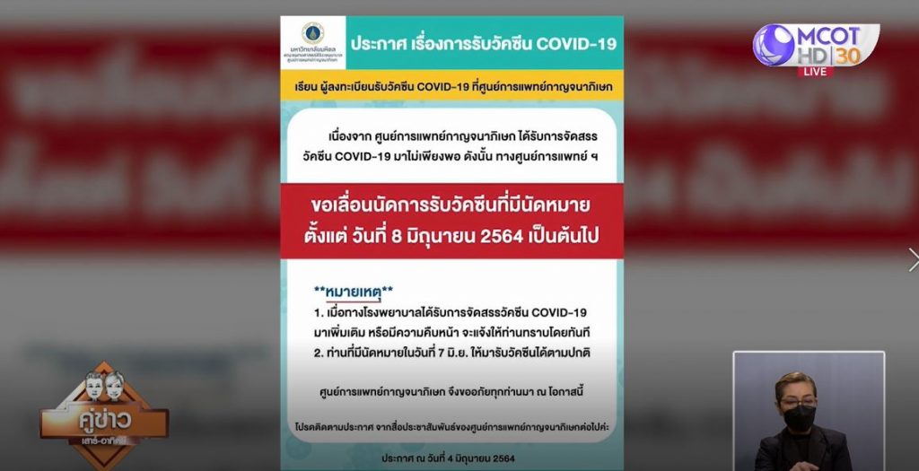 5 มิ.ย. – ราชวิทยาลัยจุฬาภรณ์ประกาศยังไม่รับจองซิโนฟาร์ม ด้านศูนย์การแพทย์กาญจนาภิเษกเลื่อนฉีดวัคซีนโควิด-19 ตั้งแต่ 8 มิ.ย.นี้เป็นต้นไป เนื่องจากได้รับการจัดสรรวัคซีนมาไม่เพียงพอ ส่วน จ.เลย ผู้ว่าฯ ออกประกาศยกเลิกนัดฉีดวัคซีนโควิด-19 ทั้งหมด