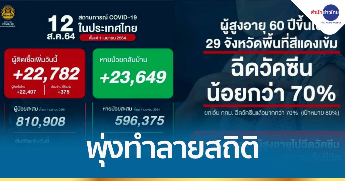กทม. 12 ส.ค. – ยอดผู้ติดเชื้อโควิด-19 วันนี้ทำนิวไฮอีก มีผู้ติดเชื้อสูงถึง 22,782 คน เสียชีวิต 147 ราย