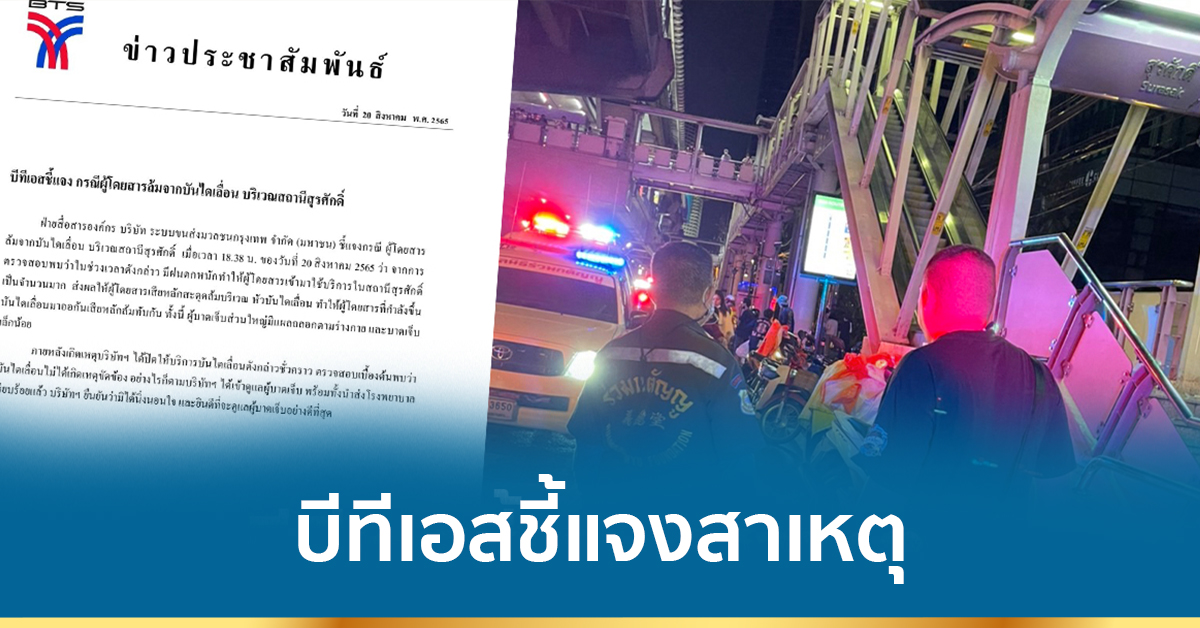 กทม. 21 ส.ค.- รถไฟฟ้าบีทีเอส ออกหนังสือชี้แจง กรณีผู้โดยสารล้มจากบันไดเลื่อน บริเวณสถานีสุรศักดิ์ เบื้องต้นพบว่าบันไดเลื่อนไม่ได้ขัดข้อง ยินดีดูแลผู้บาดเจ็บอย่างดีที่สุด