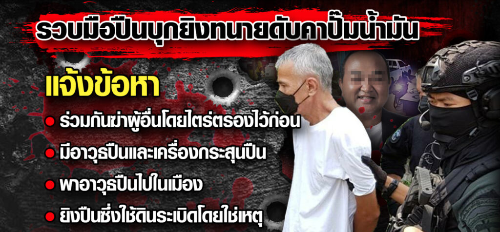 จากนั้นนำตัวไปควบคุมที่กองบังคับการปราบปราม ก่อนส่งพนักงานสอบสวนดำเนินคดีในข้อหา “ร่วมกันฆ่าผู้อื่นโดยไตร่ตรองไว้ก่อน, มีอาวุธปืนและเครื่องกระสุนปืนไว้ในความครอบครองโดยไม่ได้รับอนุญาต, พาอาวุธปืนไปในเมือง หมู่บ้าน หรือทางสาธารณะโดยเปิดเผย โดยไม่ได้รับอนุญาต หรือโดยไม่มีเหตุอันสมควร และยิงปืนซึ่งใช้ดินระเบิดโดยใช่เหตุ ในเมือง หมู่บ้านหรือที่ชุมชน”