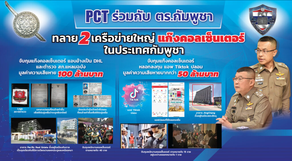กรุงเทพฯ 2 ก.ย. – ตำรวจ PCT ประสานกัมพูชา ล่าแก๊งคอลเซ็นเตอร์เพิ่ม 59 ราย ส่งกลับไทยดำเนินคดี มูลค่าความเสียหายกว่า 100 ล้านบาท