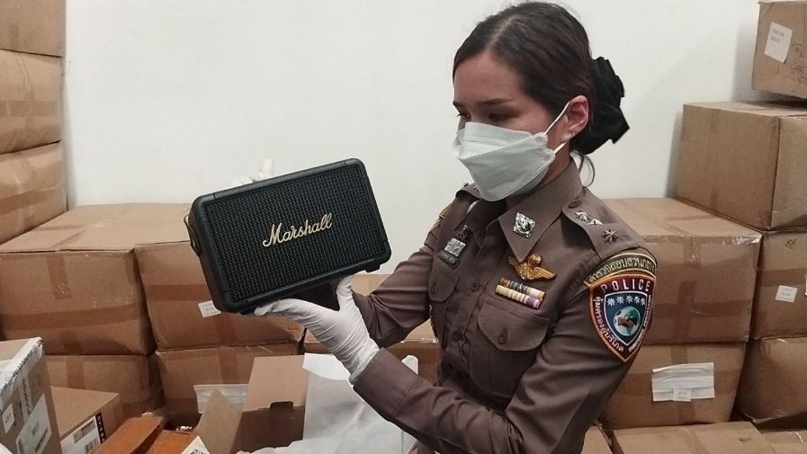 สำหรับการเข้าตรวจค้นดังกล่าว สืบเนื่องจากก่อนหน้าเจ้าหน้าที่ชุดจับกุมได้สืบทราบว่ามีการลักลอบขายลำโพงปลอมเลียนแบบยี่ห้อ Marshall ผ่านเว็บไซต์ออนไลน์ จำนวน 2 เว็บไซต์ จึงแกะรอยสืบหาเบาะแสจนทราบว่า ลำโพงปลอมที่นำมาจำหน่ายเหล่านี้ มีการนำเข้ามาจากต่างประเทศ ก่อนนำไปกักเก็บไว้ที่โกดังแห่งดังกล่าว เพื่อเตรียมนำออกจำหน่ายผ่านทางช่องทางออนไลน์ จึงนำกำลังเข้าตรวจค้น จนสามารถตรวจยึดของกลางดังกล่าวมาตรวจสอบได้ทั้งหมด ซึ่งกรณีปลอมลำโพง Marshall เป็นการกระทำผิดตาม พ.ร.บ.เครื่องหมายการค้า พ.ศ. 2534 มาตรา 110 ประกอบมาตรา 108 “มีไว้เพื่อจําหน่ายซึ่งสินค้าที่มีเครื่องหมายการค้าปลอม เครื่องหมายการค้าของบุคคลอื่นที่ได้จดทะเบียนแล้วในราชอาณาจักร” โทษจำคุกไม่เกิน 4 ปี ปรับไม่เกิน 4 แสนบาท