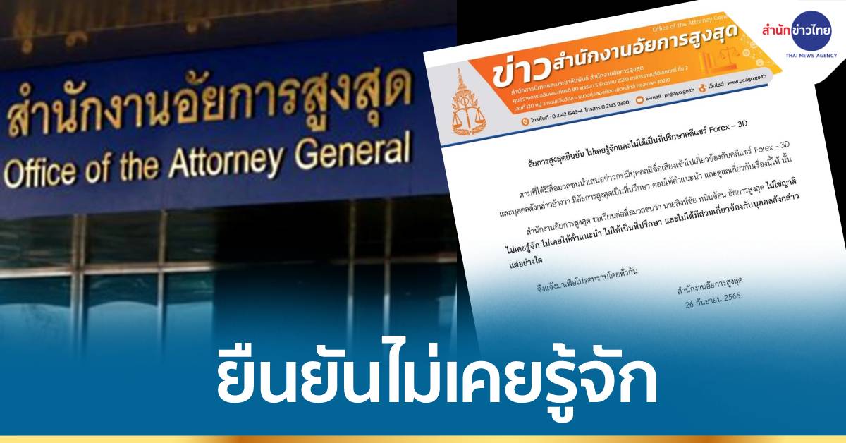 สำนักงานอัยการสูงสุดได้ออกแถลงการณ์ว่า ตามที่ได้มีสื่อมวลชนนําเสนอข่าวกรณีบุคคลมีชื่อเสียงเข้าไปเกี่ยวข้องกับคดีแชร์ Forex-3D และบุคคลดังกล่าวอ้างว่ามีอัยการสูงสุดเป็นที่ปรึกษา คอยให้คําแนะนําและดูแลเกี่ยวกับเรื่องนี้ให้นั้น