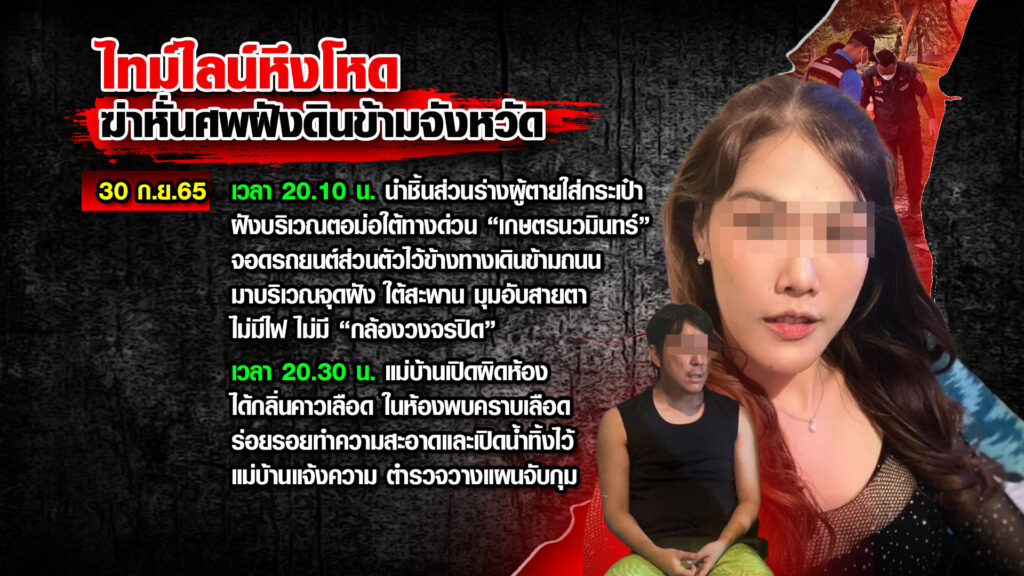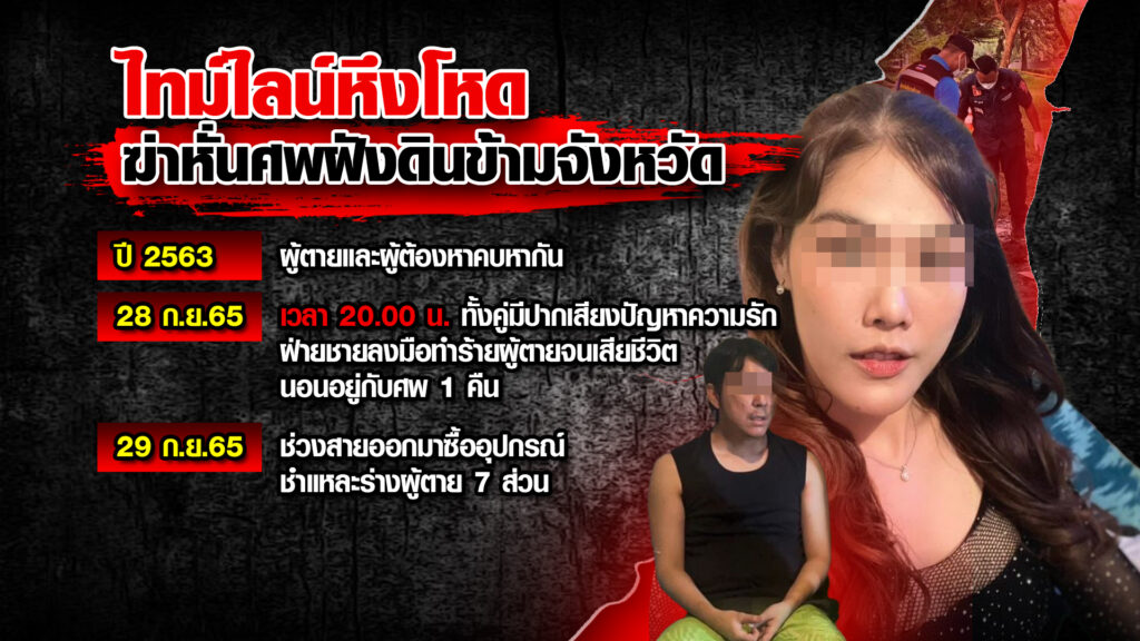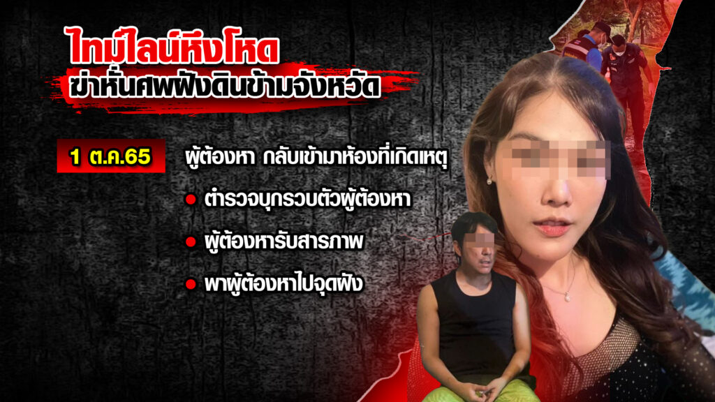 พล.ต.อ.สุรเชษฐ์ หักพาล รอง ผบ.ตร. เปิดเผยว่า ตำรวจได้สอบปากคำผู้ก่อเหตุอย่างละเอียดแล้ว ทราบว่าผู้ก่อเหตุมีภรรยาอยู่แล้ว แต่แอบมาคบกับผู้ตาย ผู้ตายจึงตีตัวออกห่าง ไม่รับโทรศัพท์ ไม่ติดต่อกัน จนผู้ก่อเหตุเกิดความหึงหวง และวางแผน “ฆ่าหั่นศพ” ล่วงหน้านาน 2 เดือน โดยมีการขุดหลุมฝังศพหนึ่งเดือนก่อนหน้า ผู้ต้องหารับว่าแทงไม่ยั้ง ต่อมาวันที่ 29 ก.ย.65 ผู้ต้องหาเริ่มหั่นศพตั้งเเต่เวลาประมาณ 10.00 – 20.00 น. จนกระทั่งวันที่ 30 ก.ย. ได้ย้ายเอาชิ้นส่วนเอาไปฝัง และวันที่ถูกจับกุม ซึ่งผู้ต้องหากลับมาที่ห้องพักคอนโดอีกครั้งเพื่อมาทำลายหลักฐาน