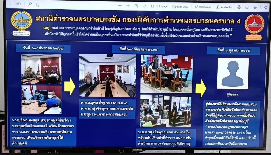 พล.ต.อ.สุรเชษฐ์ หักพาล รอง ผบ.ตร. เปิดเผยว่า เมื่อวันที่ 1 ต.ค.65 ตำรวจได้เรียกตัวรองผู้อำนวยการฯ เข้ารับทราบข้อกล่าวหา เบื้องต้นให้การปฏิเสธ ตำรวจได้แจ้งดำเนินคดีตามมาตรา 278 วรรค 2 กระทำอนาจารแก่บุคคลอายุกว่า 15 ปี โดยขู่เข็ญด้วยประการใดๆ โดยใช้กำลังประทุษร้าย โดยบุคคลนั้นอยู่ในภาวะที่ไม่สามารถขัดขืนได้ หรือโดยทำให้บุคคลนั้นเข้าใจผิดว่าตนเป็นบุคคลอื่น เป็นการกระทำโดยใช้วัตถุหรืออวัยวะอื่น ซึ่งไม่ใช่อวัยวะเพศ ล่วงล้ำอวัยวะเพศของบุคคลนั้น ระวางโทษจำคุกตั้งแต่ 4-20 ปี และปรับตั้งแต่ 80,000-400,000 บาท และนำตัวฝากขังที่ศาลมีนบุรี โดยผู้ต้องหายื่นหลักทรัพย์เป็นเงินสด 200,000 บาท ขอปล่อยตัวชั่วคราว ซึ่งศาลอนุญาตให้ปล่อยชั่วคราวแล้ว