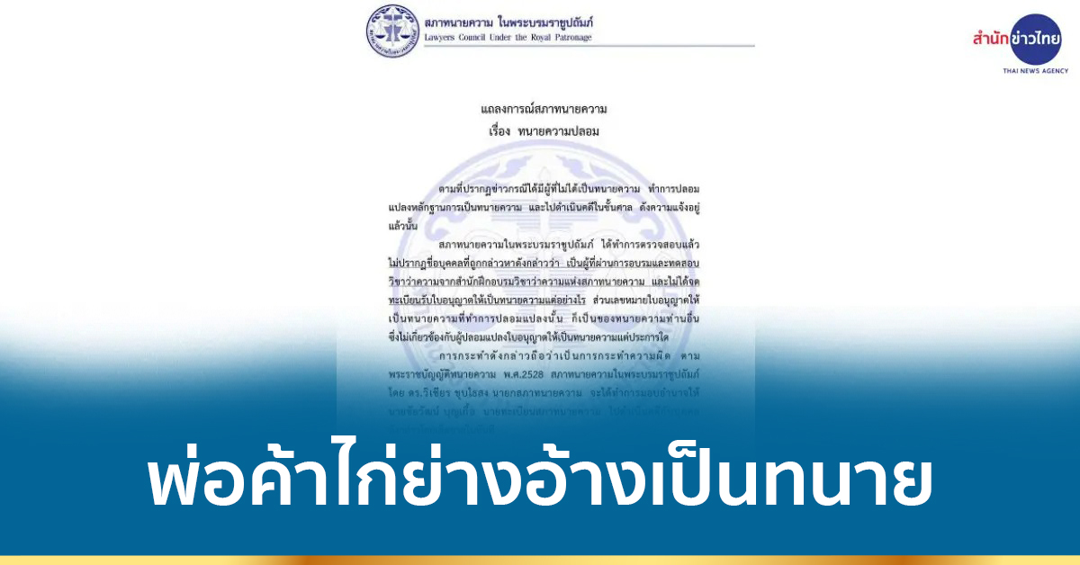 จากกรณีมีชายประกอบอาชีพพ่อค้าไก่ย่าง ในจังหวัดกำแพงเพชร ทำและใช้ใบอนุญาตทนายความปลอม เพื่อแอบอ้างตัวเป็นทนายความให้ผู้อื่นว่าจ้างให้เป็นทนายความ ขนาดถึงว่าความให้ในชั้นศาลนั้น วันนี้ผู้สื่อข่าวสำนักข่าวไทย ได้ตรวจสอบเนื้อหาของพระราชบัญญัติทนายความ พ.ศ.2528 ที่เกี่ยวข้องกับกรณีดังกล่าว พบว่า ตามมาตรา 7 ใน พ.ร.บ.ทนายความได้ให้นิยามผู้ประกอบวิชาชีพ “ทนายความ” หมายความถึง ผู้ที่สภาทนายความได้รับจดทะเบียนและออกใบอนุญาตให้เป็นทนายความ