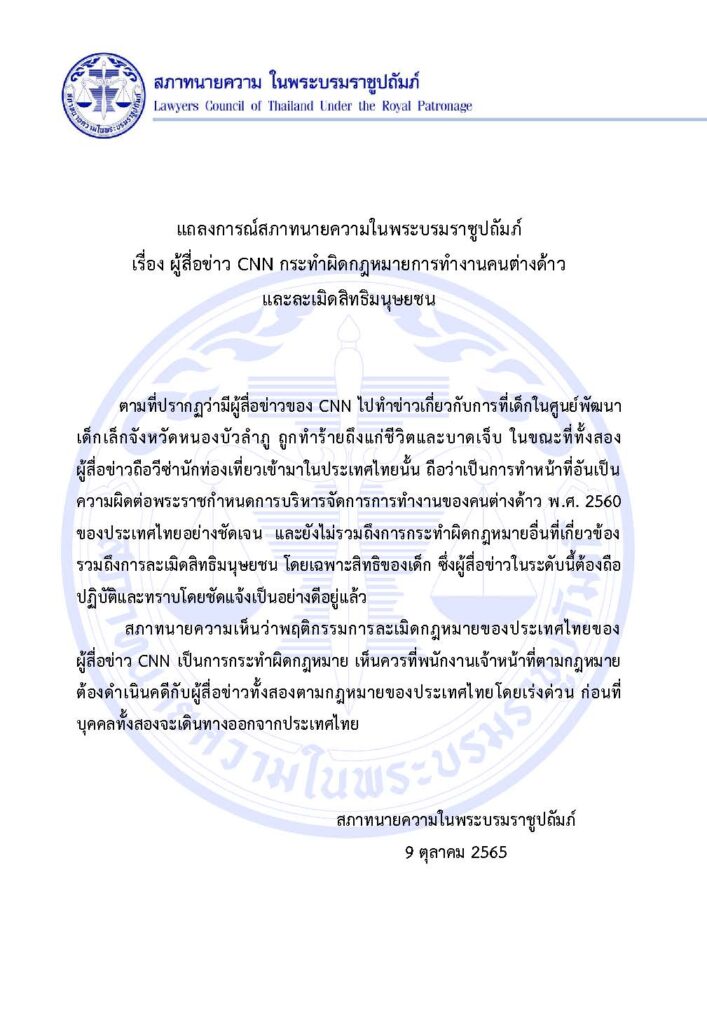 ด้านสภาทนายความได้ออกแถลงการณ์กรณีดังกล่าว ในขณะที่ทั้งสองผู้สื่อข่าวถือวีซ่านักท่องเที่ยวเข้ามาในประเทศไทยนั้น ถือว่าเป็นการทำหน้าที่อันเป็นความผิดต่อพระราชกำหนดการบริหารจัดการการทำงานของคนต่างด้าว พ.ศ. 2560 ของประเทศไทยอย่างชัดเจน และยังไม่รวมถึงการกระทำผิดกฎหมายอื่นที่เกี่ยวข้องรวมถึงการละเมิดสิทธิมนุษยชน โดยเฉพาะสิทธิของเด็ก ซึ่งผู้สื่อข่าวในระดับนี้ต้องถือปฏิบัติและทราบโดยชัดแจ้งเป็นอย่างดีอยู่แล้ว สภาทนายความเห็นว่าพฤติกรรมการละเมิดกฎหมายของประเทศไทยของผู้สื่อข่าว CNN เป็นการกระทำผิดกฎหมาย เห็นควรที่พนักงานเจ้าหน้าที่ตามกฎหมายต้องดำเนินคดีกับผู้สื่อข่าวทั้งสองตามกฎหมายของประเทศไทยโดยเร่งด่วน ก่อนที่บุคคลทั้งสองจะเดินทางออกจากประเทศไทย
