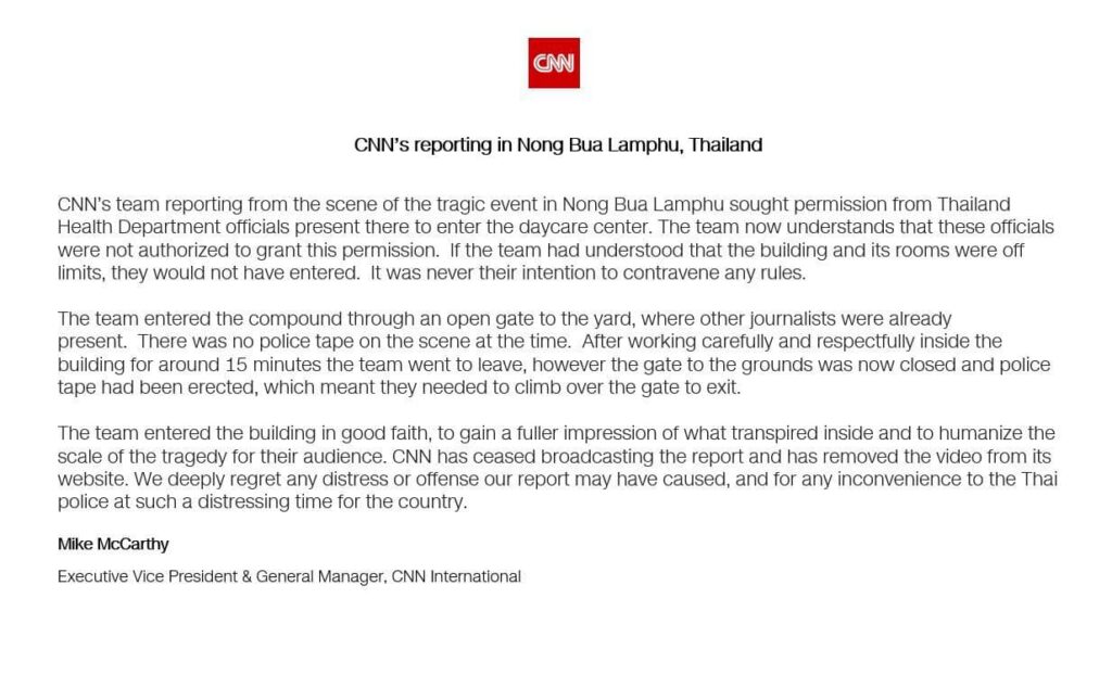 ล่าสุด มีรายงานว่า สถานีข่าวซีเอ็นเอ็น ออกแถลงการณ์ถึงการรายงานจากจุดเกิดเหตุโศกนาฏกรรมในจังหวัดหนองบัวลำภูของทีมข่าวซีเอ็นเอ็น โดยชี้แจงว่า “ทีมข่าวได้ขออนุญาตเจ้าหน้าที่กระทรวงสาธารณสุขที่อยู่ตรงจุดนั้นแล้ว เพื่อเข้าไปในศูนย์พัฒนาเด็กเล็ก ทีมข่าวเข้าใจแล้วในเวลานี้ว่า เจ้าหน้าที่เหล่านี้ไม่สามารถให้อนุญาตเข้าพื้นที่ก่ออาชญากรรมได้ หากทีมข่าวตระหนักถึงข้อเท็จจริงนี้ ว่า อาคารและห้องเรียนเหล่านี้ เป็นพื้นที่หวงห้าม ทีมข่าวจะไม่เข้าไป ทีมข่าวไม่มีเจตนาใด ๆ ที่จะก้าวล่วงกฎข้อบังคับ”