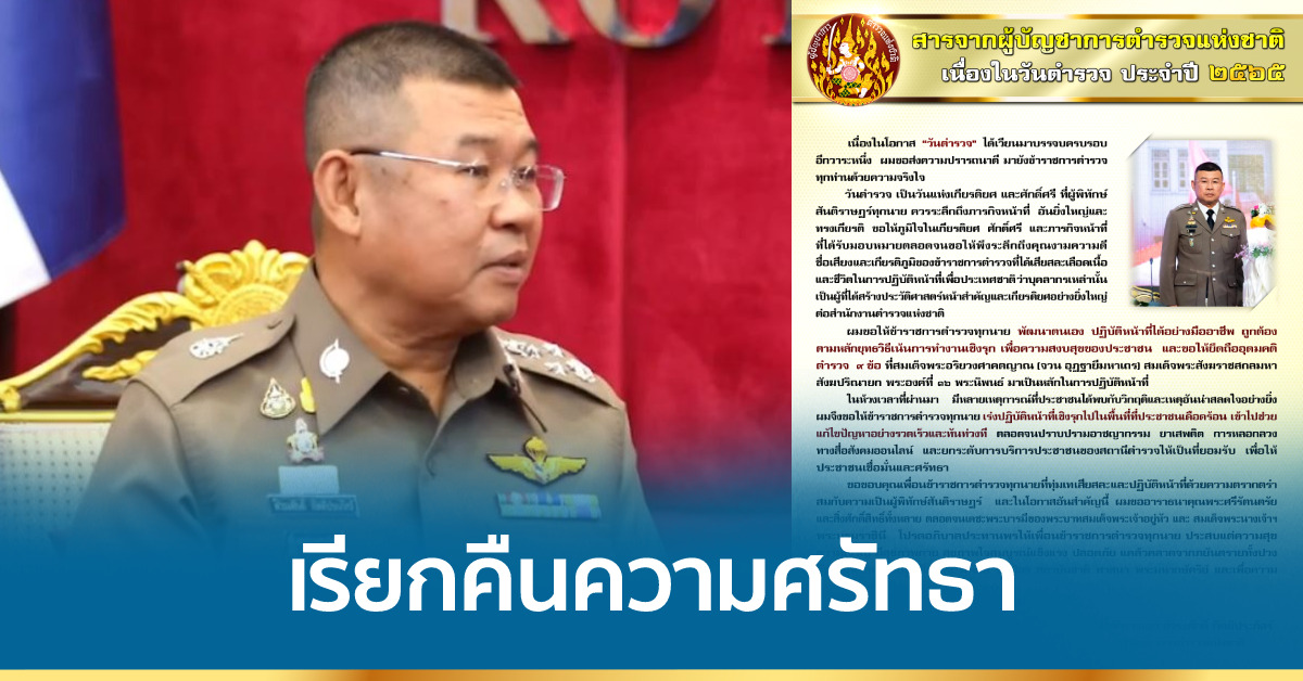 กรุงเทพฯ 16 ต.ค. – ผบ.ตร. มีสารเนื่องในวันตำรวจ ประจำปี 2565 เน้นย้ำตำรวจทุกนาย คำนึงถึงเกียรติยศหน้าที่ พร้อมปฏิบัติงานเชิงรุก ป้องกันปัญหาอาชญากรรมทุกรูปแบบ เรียกคืนความศรัทธาและความสงบสุขของประชาชน