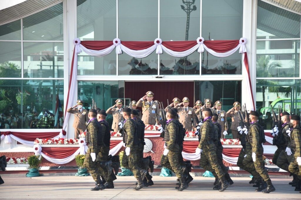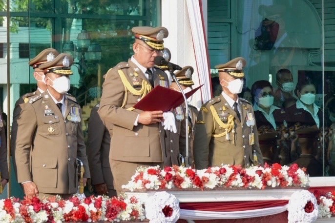 จากนั้น ผบ.ตร. ได้ขึ้นรถตรวจกำลังพลสวนสนาม และนำข้าราชการตำรวจกล่าวคำสัตย์ปฏิญาณตน ก่อนให้โอวาท พร้อมกันนั้นได้มีการเชิญธงชัยประจำกองพัน ก่อนเดินสวนสนาม
