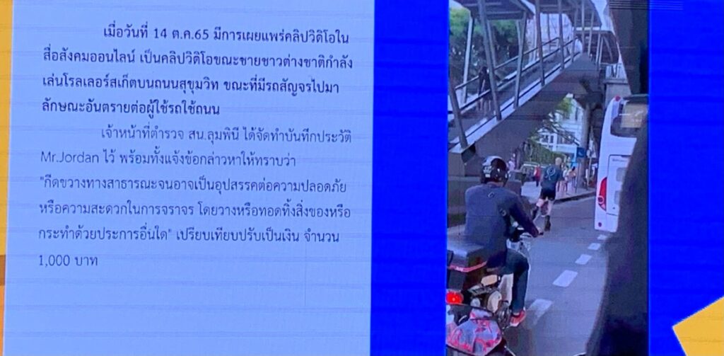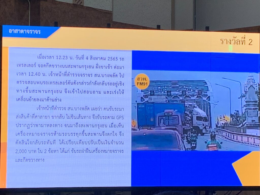 เวลา 10.30 น. พล.ต.อ.ดำรงศักดิ์ กิตติประภัสร์ ผู้บัญชาการตำรวจแห่งชาติ เป็นประธานมอบรางวัลและเกียรติบัตรให้แก่เจ้าของคลิปวิดีโอ ตามโครงการ “อาสาตาจราจร” มุ่งเน้นให้ประชาชนมีส่วนร่วมในการสร้างจิตสำนึกในการขับรถอย่างถูกกฏหมาย เพื่อความปลอดภัยบนท้องถนนประจำเดือนสิงหาคม 2565 จำนวน 11 รางวัล เช่น คลิปชายชาวต่างชาติเล่นโรลเลอร์เบลดที่ถนนสุขุมวิท เมื่อวันที่ 15 ตุลาคมที่ผ่านมา ซึ่งเผยแพร่ทาง tiktok ซึ่งเป็นหลักฐานทำให้ตำรวจ สน.ลุมพินี สามารถติดตามตัวผู้กระทำความผิดซึ่งเป็นชาวต่างชาติ มาดำเนินคดีตามกฎหมายในข้อหากีดขวางทางสาธารณะจนอาจเป็นอุปสรรคต่อความปลอดภัยหรือความสะดวกในการจราจร และปรับ 1,000 บาท และคลิปรถเทรลเลอร์กลับรถบนสะพานกรุงธน เมื่อวันที่ 4 สิงหาคม ที่ทำให้การจราจรติดขัด โดยคนขับถูกแจ้งดำเนินคดีข้อหาขับรถฝ่าเครื่องหมายจราจรและกีดขวางทาง ปรับ 2,000 บาท