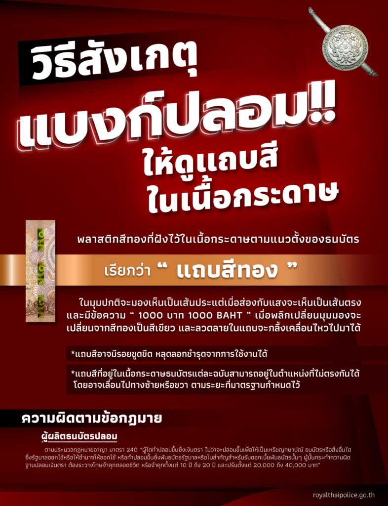 พล.ต.ต.อาชยน กล่าวต่อว่า สำหรับวิธีสังเกตในเบื้องต้นธนบัตรใบละ 1,000 บาท ว่าปลอมหรือไม่ ให้ดูที่ “แถบสีในเนื้อกระดาษ” ดังนี้ เป็นพลาสติกสีทองที่ฝังไว้ในเนื้อกระดาษตามแนวตั้งของธนบัตร จึงเรียกว่า “แถบสีทอง” ในมุมปกติจะมองเห็นเป็นเส้นประ แต่เมื่อส่องกับแสงจะเห็นเป็นเส้นตรงและมีข้อความ “1000 บาท 1000 BAHT” เมื่อพลิกเปลี่ยนมุมมองจะเปลี่ยนจากสีทองเป็นสีเขียว และลวดลายในแถบจะกลิ้งเคลื่อนไหวไปมาได้แถบสีอาจมีรอยขูดขีด หลุดลอกชำรุดจากการใช้งานได้ แถบสีที่อยู่ในเนื้อกระดาษธนบัตรแต่ละฉบับสามารถอยู่ในตำแหน่งที่ไม่ตรงกันได้ โดยอาจเลื่อนไปทางซ้ายหรือขวา ตามระยะที่มาตรฐานกำหนดไว้ โดยโทษฐานปลอมหรือแปลงธนบัตร ประมวลกฎหมายอาญา มาตรา 240 ระบุไว้ว่า ผู้ใดทำปลอมขึ้นซึ่งเงินตรา ไม่ว่าจะปลอมขึ้นเพื่อให้เป็นเหรียญกษาปณ์ ธนบัตรหรือสิ่งอื่นใด ซึ่งรัฐบาลออกใช้หรือให้อำนาจให้ออกใช้ หรือทำปลอมขึ้นซึ่งพันธบัตรรัฐบาลหรือใบสำคัญสำหรับรับดอกเบี้ยพันธบัตรนั้นๆ ผู้นั้นกระทำความผิดฐานปลอมเงินตรา ต้องระวางโทษจำคุกตลอดชีวิต หรือจำคุกตั้งแต่ 10 ปี ถึง 20 ปี และปรับตั้งแต่ 20,000 ถึง 40,000 บาท