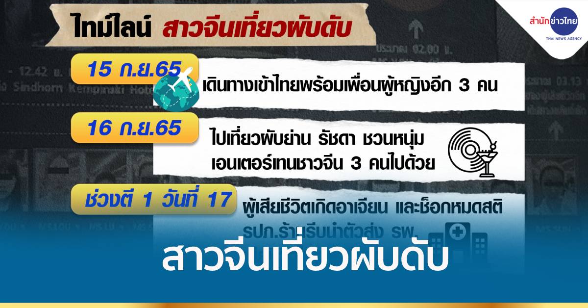คดีนี้ พล.ต.อ.สุรเชษฐ์ หักพาล รอง ผบ.ตร. ให้ข้อมูลว่า เกิดขึ้นตั้งแต่ช่วงตี 1 วันที่ 17 กันยายน สาวจีนวัย 32 ปี ถูกพบเสียชีวิตปริศนาหลังไปเที่ยวผับย่านรัชดาฯ กับเพื่อน และคดีได้รับความสนใจในหมู่คนจีน เพราะผู้เสียชีวิตอยู่ในแวดวงไฮโซ รวมถึงญาติคาใจสาเหตุการเสียชีวิต