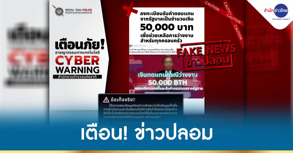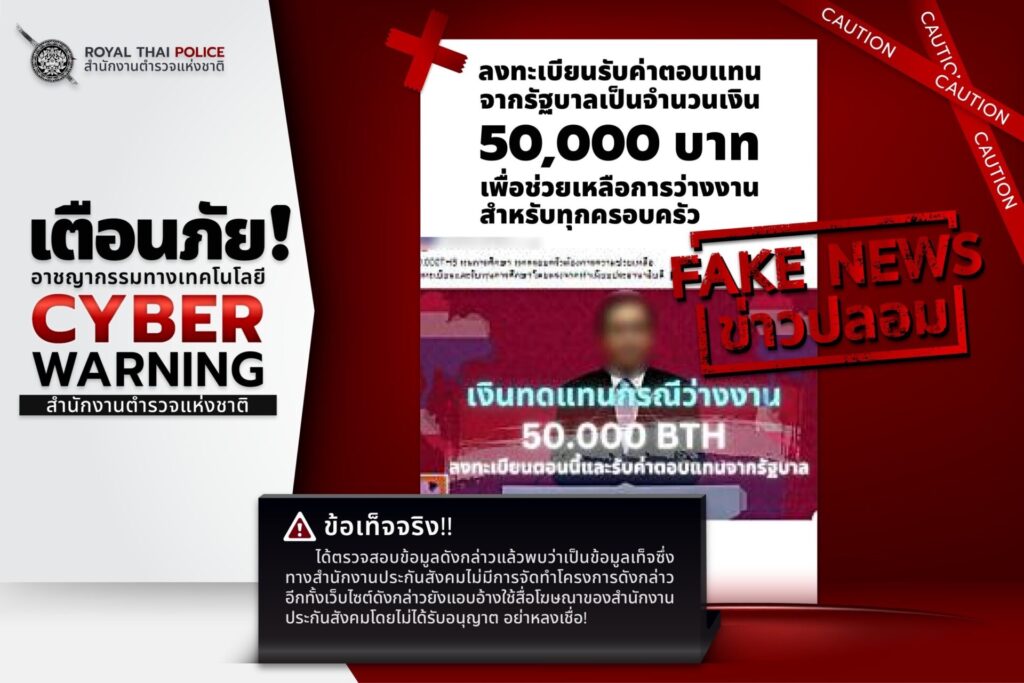 พ.ต.ต.หญิง ณพวรรณ ปัญญา รองโฆษก ตร. เปิดเผยกรณีที่มีการเผยแพร่ข้อมูลข่าวสารในสื่อสังคมออนไลน์ เกี่ยวกับลงทะเบียนรับค่าตอบแทนจากรัฐบาล 50,000 บาท เพื่อช่วยเหลือการว่างงานสำหรับทุกครอบครัว ซึ่งทางสำนักงานประกันสังคม ไม่มีการจัดทำโครงการดังกล่าว