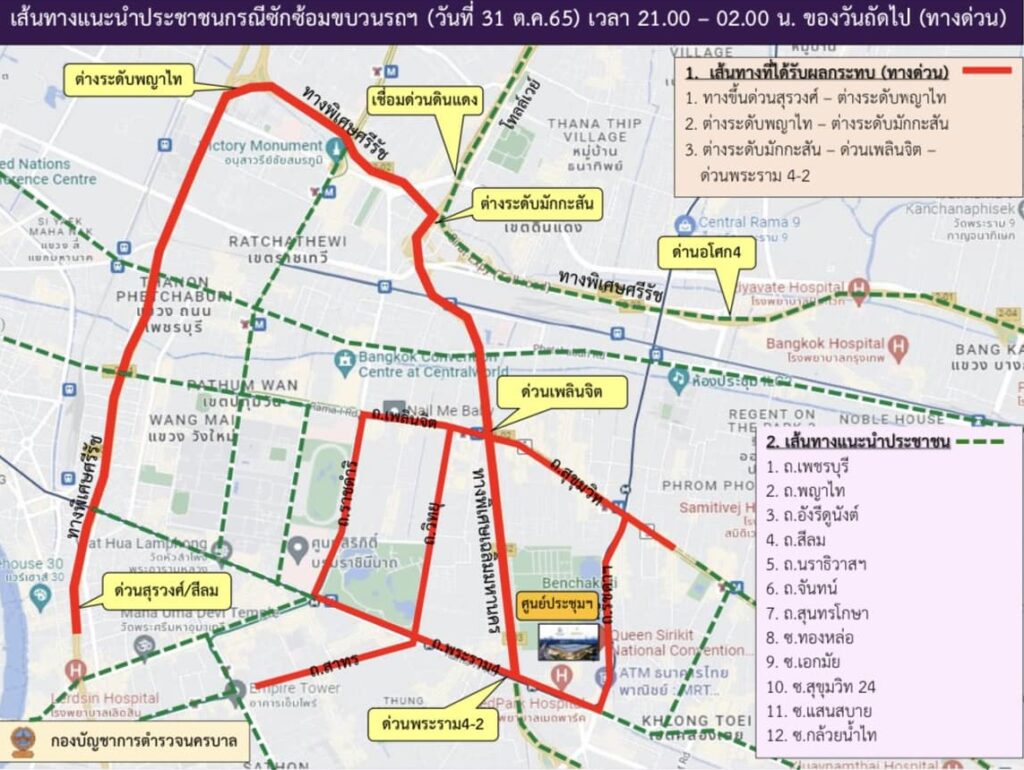 กรุงเทพฯ 31 ต.ค. – บช.น.แจ้งประชาสัมพันธ์หลีกเลี่ยงเส้นทาง การซ้อมขบวนรองรับการประชุมเอเปควันที่ 31 ตุลาคม 2565 เวลา 21.00– 02.00 น. ของวันถัดไป บริเวณพื้นที่รอบศูนย์การประชุมแห่งชาติสิริกิติ์