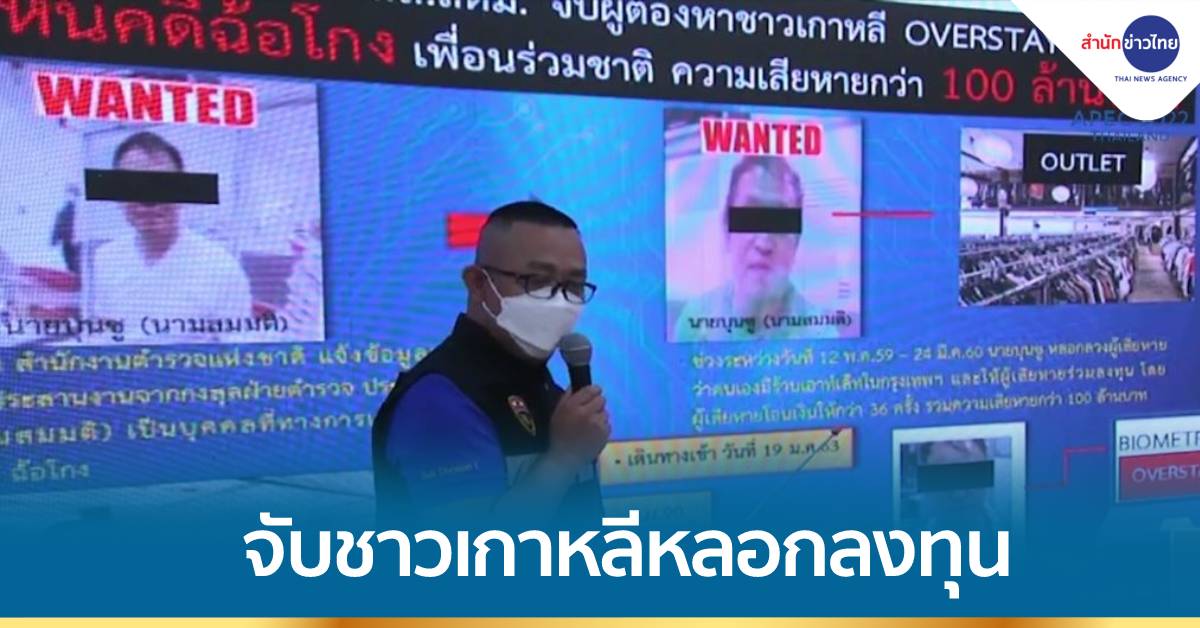 กรุงเทพฯ 4 พ.ย.- ตำรวจเกาหลีใต้ประสานความร่วมมือตำรวจไทย จับกุมชายชาวเกาหลีวัย 62 ปี มีพฤติกรรมหลอกลวงลงทุนที่เกาหลีใต้ อ้างมีร้านค้าในไทยเป็นฐานการทำธุรกิจ ผู้เสียหายหลงเชื่อสูญเงินกว่า 3,558 ล้านวอน หรือประมาณ 100 ล้านบาท เตรียมส่งตัวกลับไปดำเนินคดีที่เกาหลีใต้