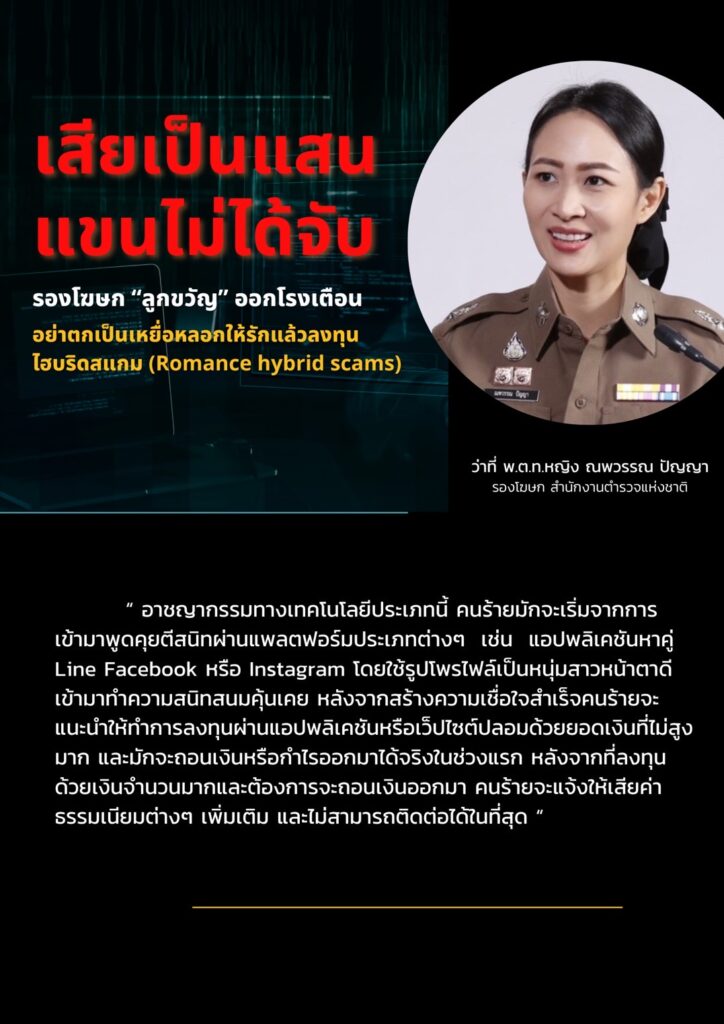 ตร. 6 พ.ย.- รองโฆษก ตร. เตือนอย่าตกเป็นเหยื่อหลอกให้รักแล้วลงทุน ไฮบริดสแกม (Romance hybrid scams) เผยยอดความเสียหายสูงถึง 861 ล้านบาท