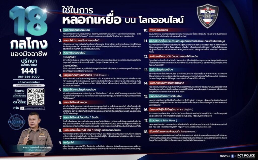 ปัจจุบันปัญหาอาชญากรรมทางเทคโนโลยี ได้สร้างความเดือดร้อนให้กับประชาชนอย่างมาก สำนักงานตำรวจแห่งชาติ โดย พล.ต.อ.ดำรงศักดิ์ กิตติประภัสร์ ผบ.ตร. ได้มีการประชาสัมพันธ์เตือนภัยพี่น้องประชาชน รูปแบบกลโกงของคนร้ายรวมทั้งสิ้น 18 วิธี หากพบเห็นบุคคลใด หรือ เว็บไซต์ใด ที่มีพฤติกรรมดังกล่าว หรือน่าสงสัยว่าอาจเป็นกลุ่มมิจฉาชีพมาหลอกลวง สามารถแจ้งเบาะแสไปยัง สายด่วน บช.สอท. 1441 หรือ ศูนย์ PCT 081-8663000 ผู้เสียหายสามารถแจ้งความผ่านระบบออนไลน์ได้ที่เว็บไซต์ www.thaipoliceonline.com และสามารถติดตามรูปแบบการประชาสัมพันธ์กลโกงได้ที่ pctpr.police.go.th .-สำนักข่าวไทย