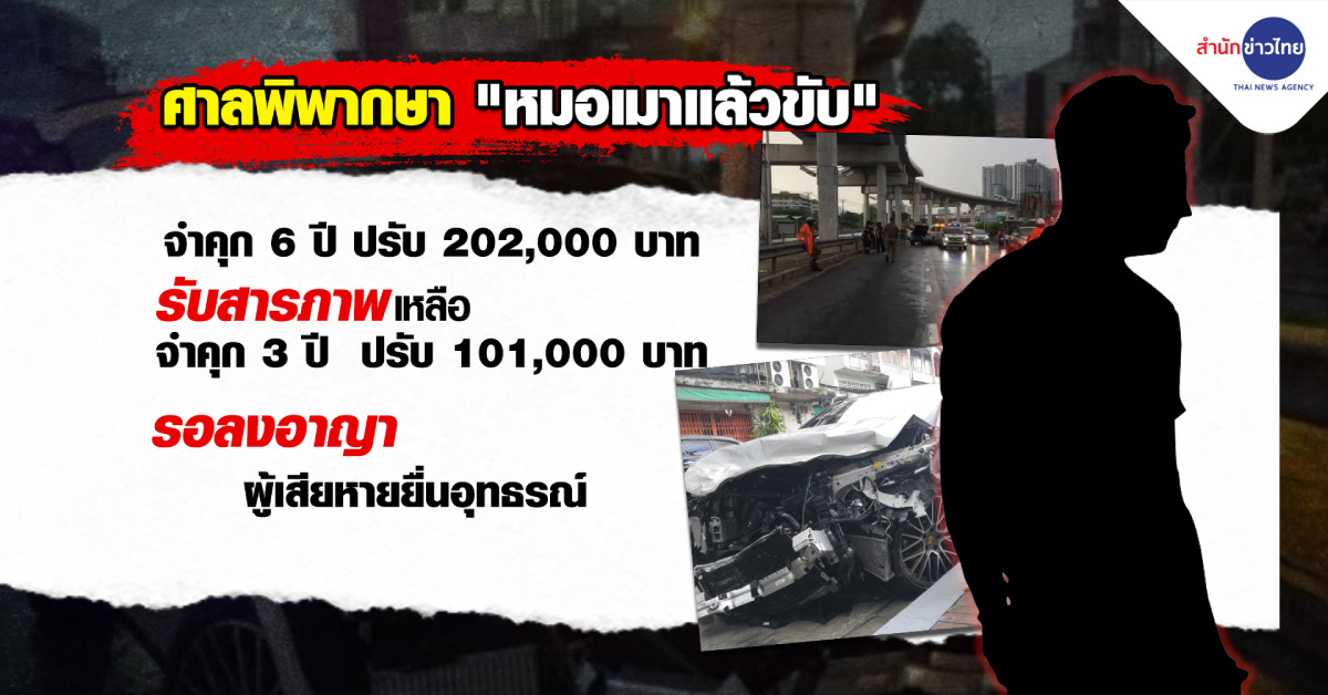 กรุงเทพฯ 7 พ.ย. – ศาลสั่งจำคุก 6 ปี ปรับ 202,000 บาท หมอเมาซิ่งรถหรู ชนเก๋ง ดับ 2 สาหัส 1 ให้การสารภาพเป็นประโยชน์ลดโทษให้กึ่งหนึ่ง เหลือคุก 3 ปี ปรับ 101,000 บาท โทษจำคุกรอลงอาญา 2 ปี ลูกชายผู้ตายเตรียมยื่นอุทธรณ์