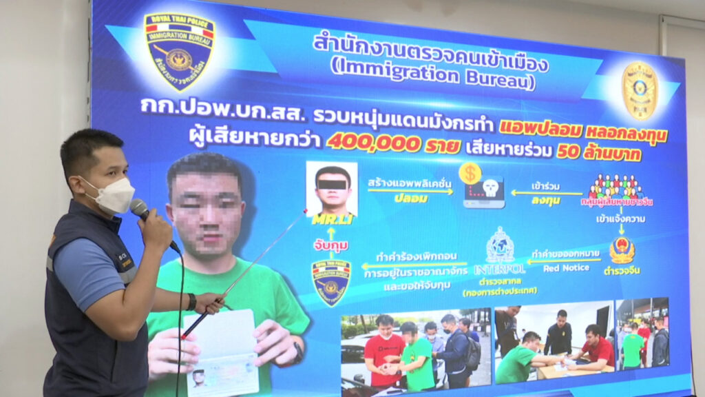 คดีแรก ตำรวจ ตม. สามารถจับกุมนายหลี่ (นามสมมุติ) สัญชาติจีน อายุ 27 ปี ซึ่งมีหมายจับจากทางการจีนในคดีฉ้อโกงประชาชนผ่านแอปพลิเคชัน ซึ่งมีผู้เสียหาย กว่า 4 แสนราย มูลค่าความเสียหาย 50 ล้านบาท ซึ่งจากการสืบสวนและติดตามเส้นทางการหลบหนีของทางการจีน พบว่านายหลี่ ได้หลบหนีเข้ามาในประเทศไทย จึงประกาศหมายจับดังกล่าวลงในอินเตอร์โพล ก่อนประสานทางการไทยเร่งดำเนินการจับกุมและในที่สุดทางการก็จับกุมนายหลี่ ได้ที่หน้าบ้านพักย่านสุทธิสาร จากการสอบสวนนายหลี่รับสารภาพได้ร่วมกับพวก เปิดแอปพลิเคชัน ให้คนจีนร่วมลงทุนเพื่อผลกำไร แต่หลังจากมีคนเข้ามาเป็นจำนวนมาก ยอดเงินสูงพอสมควรจึบปิดแอปพลิเคชันหนีหายพร้อมกับเงิน ก่อนแยกย้ายกันหลบหนีออกนอกประเทศ