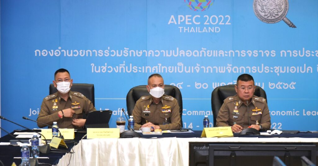 พล.ต.ต.อาชยน ไกรทอง ในฐานะโฆษกกองอำนวยการร่วมรักษาความปลอดภัยและการจราจร การประชุมเอเปค 2565 เปิดเผยถึงผลการประชุมมาตรการดูแลความปลอดภัย การบริหารจัดการจราจร และสถานการณ์การข่าว ว่า “พล.ต.อ.ดำรงศักดิ์ กิตติประภัสร์” ผบ.ตร. ในฐานะ รอง ผอ.กอ.ร่วมฯ พร้อมด้วย พล.ต.อ.รอย อิงคไพโรจน์ รอง ผบ.ตร., พล.ต.อ.กิตติ์รัฐ พันธุ์เพ็ชร์, พล.ต.อ.ต่อศักดิ์ สุขวิมล รอง ผบ.ตร. ตัวแทนกองบัญชากองทัพไทย กระทรวงการต่างประเทศ กระทรวงสาธารณสุข และหน่วยงานที่เกี่ยวข้องกว่า 30 หน่วยงาน เข้าร่วมประชุม เพื่อบูรณาการทุกภาคส่วนขับเคลื่อนการประชุมเอเปค 2565 ให้เป็นไปด้วยความเรียบร้อย