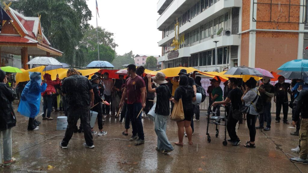 ขณะนั้นได้มีฝนตกลงมา ทำให้ผู้ชุมนุมบางส่วนกระจายหลบฝนไปอยู่ในที่ร่มซึ่งเป็นเต็นท์ของวินจักรยานยนต์ ใต้รถไฟฟ้า แต่ก็ยังมีบางส่วนยืนตากฝนใช้ไม้ตีถังร้องเพลง พร้อมตะโกนให้ปล่อยตัวกลุ่มเพื่อนๆ ที่ถูกจับกุม ต่อมาหลังจากฝนหยุดตก กลุ่มผู้ชุมนุมที่หลบฝนอยู่ได้ออกมารวมตัวกันหน้า สน. อีกครั้ง