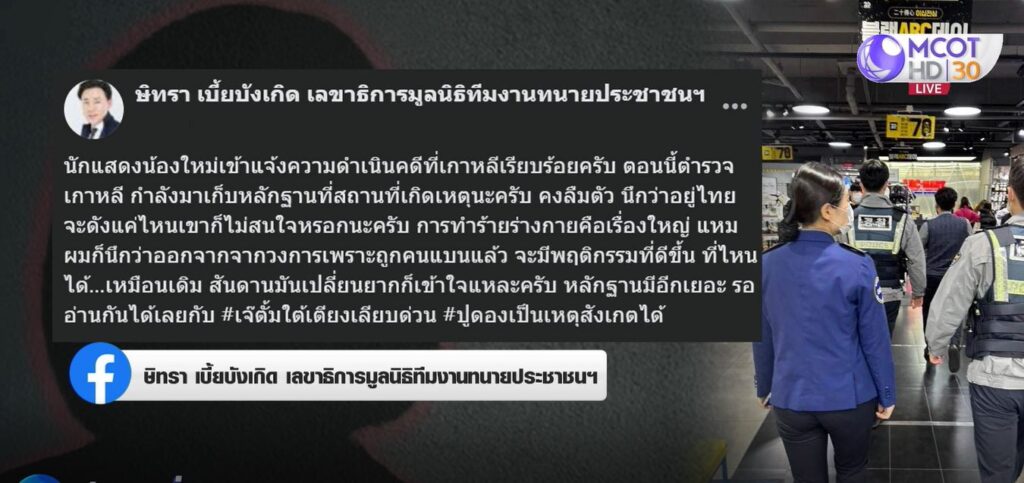 นายษิทรา กล่าวอีกว่า ระหว่างนั้นดารารุ่นใหญ่คนนี้อยากกินปู แต่ดาราน้องใหม่ยังมีคิวหนังที่ต้องแสดง จึงปฏิเสธ ก็ถูกตีตามตัว 2 ครั้ง ดารารุ่นใหญ่คนนี้ยังพยายามชวนไปกินปูอีก แต่เมื่อถูกปฏิเสธอีกรอบ ครั้งนี้นักแสดงน้องใหม่ถูกตบหน้าอย่างแรง 1 ครั้ง โดยมีคนเต็มไปหมด เจ้าตัวยังเกรงใจจึงไม่แสดงอาการอะไร แต่ด้วยความรู้สึกอับอายจึงไปปรึกษาพ่อกับแม่แล้วตัดสินใจแจ้งความกับตำรวจเกาหลีใต้ ล่าสุดมีการรวบรวมหลักฐาน พร้อมสอบปากคำผู้เห็นเหตุการณ์แล้ว แม้เหตุนี้จะเกิดที่ต่างแดน แต่สามารถเอาผิดได้ โดยสำนักงานอัยการสูงสุดจะเป็นผู้ดำเนินการ