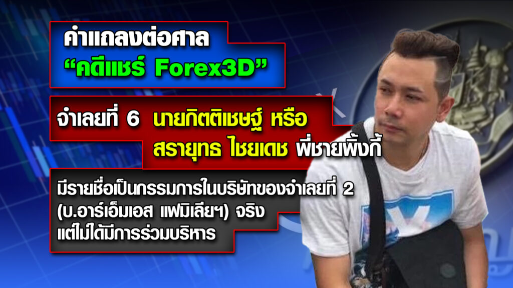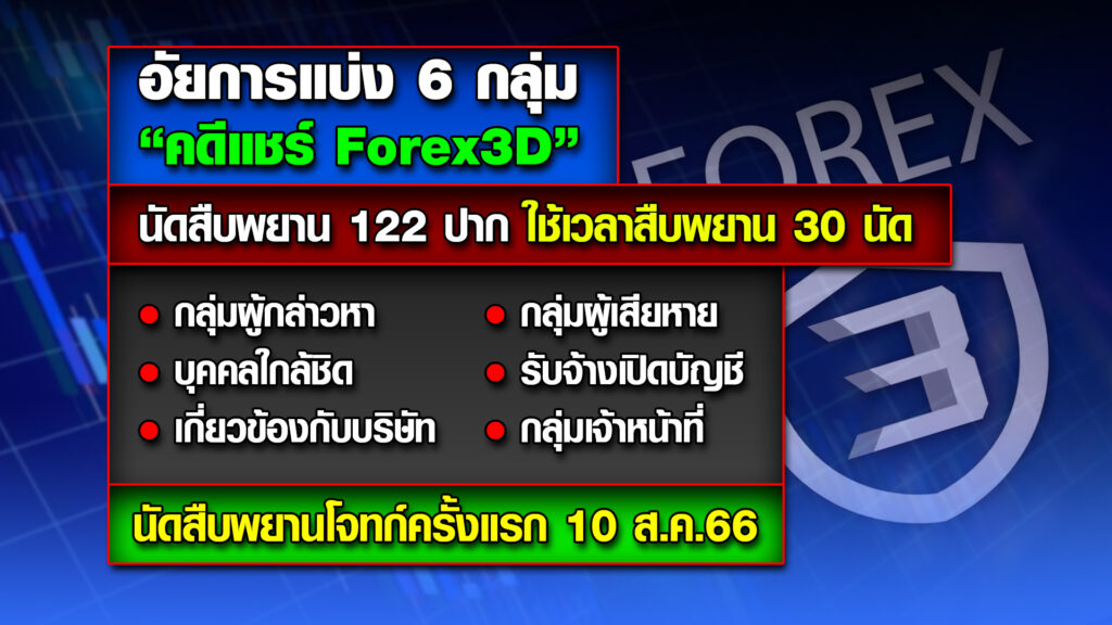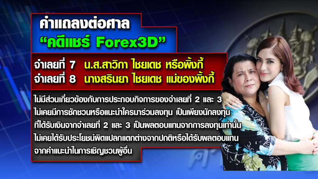 คดีนี้ จำเลยรวม 24 คน ร่วมกันหลอกลวงประชาชนผู้เสียหายให้มาร่วมลงทุนเล่นแชร์ Forex-3D ทั้งที่ความจริงแล้วพวกจำเลยไม่ได้ประกอบกิจการซื้อขายหรือเทรดเงินตราต่างประเทศ (Forex) จริงตามที่กล่าวอ้าง และธนาคารแห่งประเทศไทย (ธปท.) ยังไม่เคยให้ใบอนุญาตแก่บุคคลหรือนิติบุคคลใด เพื่อให้บริการลงทุนโดยเก็งกำไรจากการซื้อขายหรือเทรดอัตราแลกเปลี่ยนเงินตราต่างประเทศ (Forex) ในประเทศไทยอีกด้วย โดยพวกจำเลยอาศัยโอกาสจากความมีชื่อเสียง หรือความน่าเชื่อถือของพวกจำเลยที่เป็นดารานักแสดง นักร้อง บุคคลในวงการบันเทิง บุคคล ในวงการสังคมชั้นสูงหรือไฮโซ และรวมถึงบุคคลที่มีชื่อเสียงในประเทศไทย เพื่อสร้างความน่าเชื่อถือ ในลักษณะแบ่งหน้าที่กันทำ และเมื่อพวกจำเลยได้รับเงินจากประชาชนผู้ร่วมลงทุนไว้แล้ว ได้นำเงินจากประชาชนรายนั้นหรือรายอื่นๆ มาจ่ายผลประโยชน์ตอบแทน หมุนเวียนให้แก่ประชาชนรายอื่น โดยพวกจำเลยกับพวกมิได้นำเงินไปลงทุนหรือประกอบกิจการอย่างใดให้ได้รับผลตอบแทนคืนให้แก่ประชาชน แต่มีเจตนาหลอกลวงประชาชนที่หวังจะได้รับเงินตอบแทนในอัตราสูง ให้นำเงินมาลงทุน จนมีประชาชนผู้เสียหายหลงเชื่อถูกหลอกลวงจำนวนมาก อันเป็นการกระทำความผิดฐานโดยทุจริต หรืออันเป็นความผิดต่างกรรมต่างวาระกัน รวม 9,824 กรรม มูลค่าความเสียหาย 2,489,820,321.52 บาท .-สำนักข่าวไทย