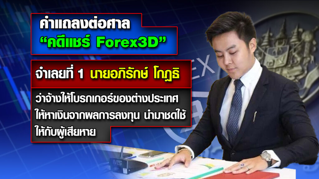 โดยจำเลยที่ 1 นายอภิรักษ์ โกฎธิ ผู้บริหารแชร์ Forex-3D แถลงต่อศาลว่า ได้ทำการว่าจ้างให้โบรกเกอร์ต่างประเทศ นำเงินที่ได้จากผลการลงทุน มาเฉลี่ยชดใช้ให้กับผู้เสียหายทั้งหมด