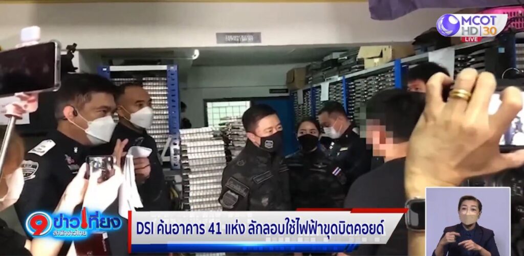 เจ้าหน้าที่ดีเอสไอ กองคดีเทคโนโลยีและสารสนเทศ กระจายตรวจค้น ตามแผนปฏิบัติการ “Electrical Shock” ยุทธการปราบโกงสายฟ้าฟาด ร่วมกับสถาบันนิติวิทยาศาสตร์ กรมศุลกากร การไฟฟ้านครหลวง และการไฟฟ้าส่วนภูมิภาค ค้นอาคารพาณิชย์ต้องสงสัยลักลอบใช้กระแสไฟฟ้า 41 จุด ใช้เป็นจุดทำเหมืองขุดเงินดิจิทัล ในพื้นที่จังหวัดนนทบุรี และกรุงเทพมหานคร โดยนำเครื่องมือที่ใช้ขุดบิทคอยน์มาจากต่างประเทศ ใช้กระแสไฟฟ้าปริมาณมากขนาดเทียบเท่ากับโรงงานอุตสาหกรรม โดยลักลอบต่อไฟตรง ไม่ผ่านมิเตอร์วัดไฟ มีความผิดฐานลักทรัพย์ตามประมวลกฎหมายอาญา และอาจมีความผิดอาญาอื่นที่เกี่ยวข้องอีกหลายฐานความผิด