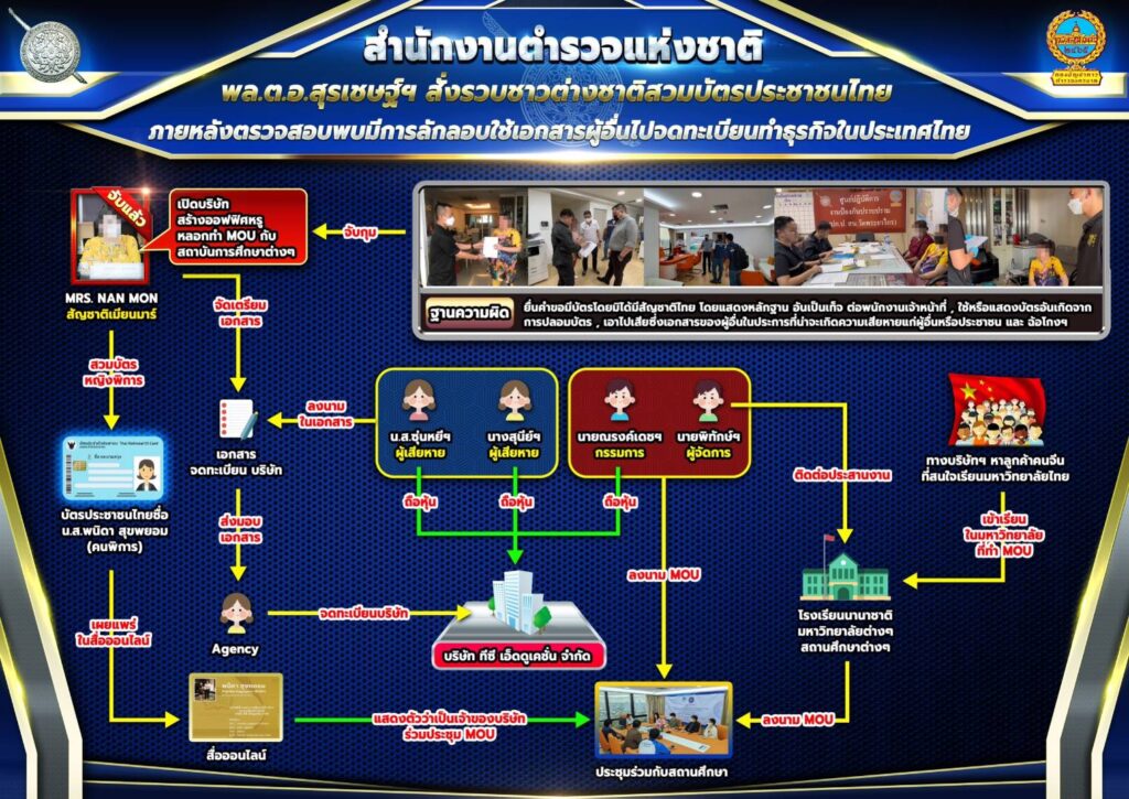 พล.ต.อ.สุรเชษฐ์ ยังระบุอีกว่า ขณะนี้พบชาวต่างชาติที่สวมบัตรประชาชนคนไทย เตรียมเปิดตัวเป็นนายหน้าหาสถานศึกษาเพื่ออำนวยความสะดวกให้กับชาวต่างชาติใช้เป็นหลักฐานขออนุญาตอยู่ต่อในราชอาณาจักรไทย และเตรียมตรวจสอบสถาบันการศึกษา 7-8 แห่ง ที่อาจจะเข้าข่ายความผิดร่วมกับเครือข่ายนี้ หากผิดก็จะดำเนินคดีตามกฎหมาย.-สำนักข่าวไทย