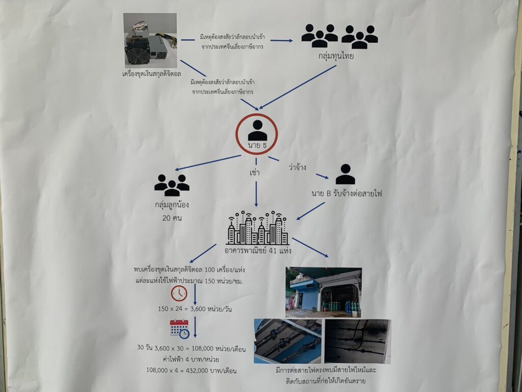 เมื่อวันที่ 30 พ.ย.ที่ผ่านมา ตรวจยึดเครื่องขุดเงินสกุลดิจิทัลได้กว่า 3,500 เครื่อง ชิ้นส่วนอะไหล่อีกจำนวนหนึ่ง รวมมูลค่ากว่า 50 ล้านบาท อาคารพาณิชย์ 41 แห่ง แต่ละแห่งจะมีการวางเครื่องขุดเงินบิตคอยน์ จุดละ 100 เครื่อง ลักลอบต่อไฟตรงเข้าตัวอาคารไม่ผ่านมิเตอร์วัดไฟ ทำให้เสียค่าไฟฟ้าต่ำกว่าความเป็นจริงอย่างมาก จากที่ต้องเสียค่าไฟฟ้าประมาณเดือนละ 300,000-500,000 บาทต่อแห่ง แต่มีการจ่ายค่าไฟจริงเพียงแห่งละ 300-2,000 บาทเท่านั้น ทำให้การไฟฟ้านครหลวงเสียหายกว่า 20 ล้านบาทต่อเดือน หรือปีละเกือบ 200-300 ล้านบาท ขณะที่เครือข่ายนี้มีรายได้จากการขุดบิตคอยน์ถึงเดือนละ 4.2 ล้านบาท