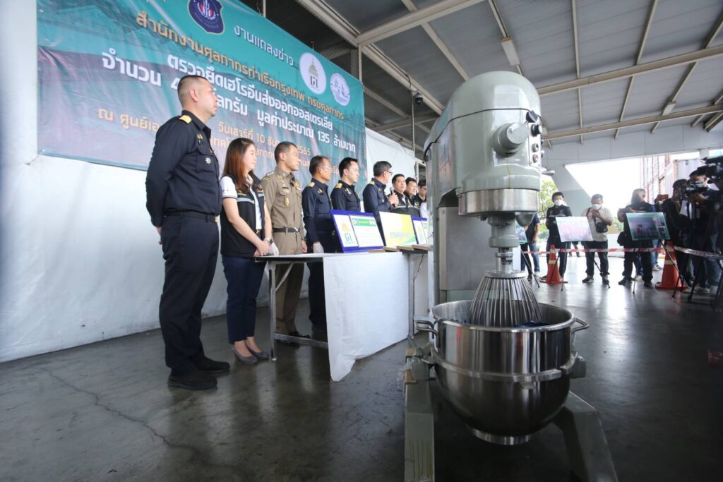 โดยการตรวจยึดครั้งนี้มาจากการที่เจ้าหน้าที่ พบสินค้าต้องสงสัย สำแดงเป็นเครื่องผสมแป้งโด เตรียมส่งออกจากท่าเรือกรุงเทพฯ ประเทศไทย ไปยังปลายทางที่บริสเบน ประเทศออสเตรเลีย เมื่อวิเคราะห์ภาพเอกซเรย์พบความผิดปกติภายในสินค้า โดยพบว่าเป็นเครื่องผสมแป้งเก่า ผ่านการใช้งานแล้ว และมีการตัดช่องลับใส่เฮโรอีนลงไป ก่อนจะเชื่อมปิดและพ่นสีทับ ซึ่งภายในเจ้าหน้าที่พบเฮโรอีนจำนวน 45 กิโลกรัมซุกซ่อนอยู่ มูลค่ากว่า 135 ล้านบาท และหากสามารถส่งออกไปยังประเทศออสเตรเลียได้สำเร็จ จะมีมูลค่าพุ่งสูงถึง 1,350 ล้านบาท