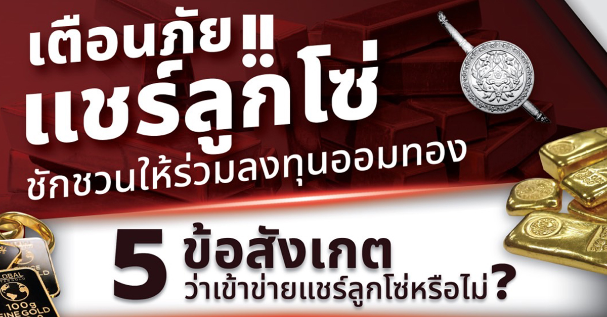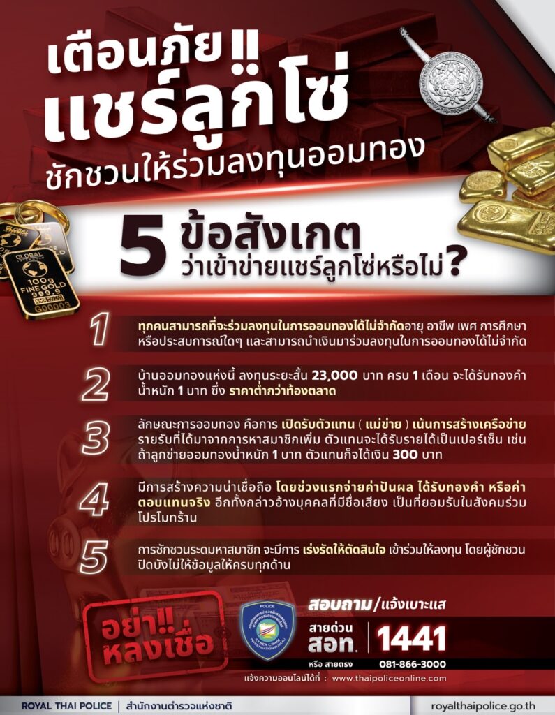 โฆษก ตร. กล่าวต่อว่า วิธีป้องกันตนเองต่อภัยโจรออนไลน์ในหลากหลายรูปแบบ ในกรณีนี้สามารถตั้งข้อ สังเกตว่าอาจเข้าข่ายแชร์ลูกโซ่ออมทอง ได้ดังนี้