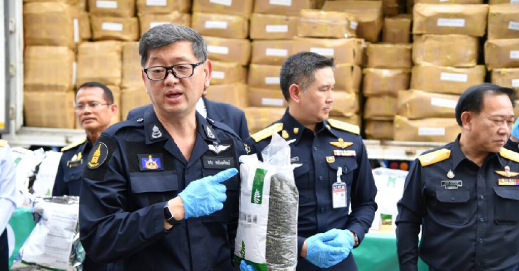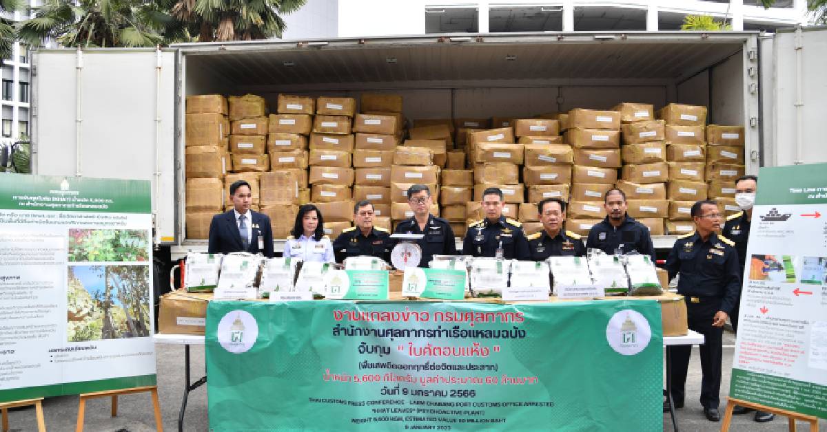 กรมศุลฯ 9 ม.ค. – นายพชร อนันตศิลป์ อธิบดีกรมศุลกากร แถลงข่าวการตรวจยึดใบพืช “Khat” (ใบคัตอบแห้ง) นำเข้าจากต่างประเทศ น้ำหนัก 5,600 กิโลกรัม มูลค่าของกลาง 60 ล้านบาท ณ กรมศุลกากร คลองเตย