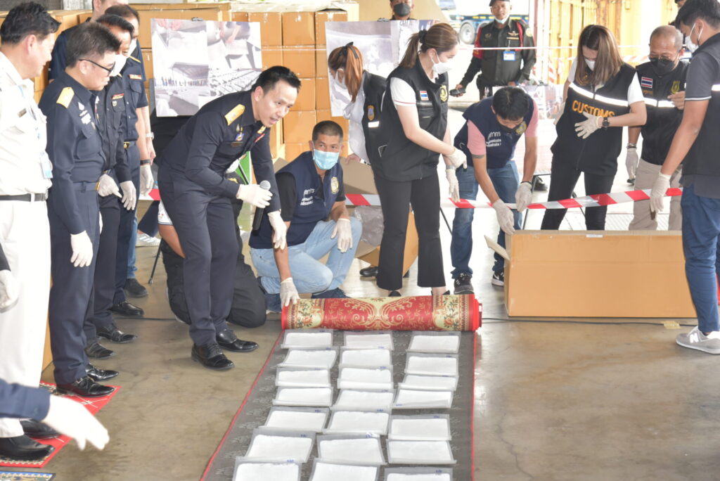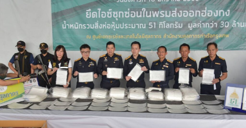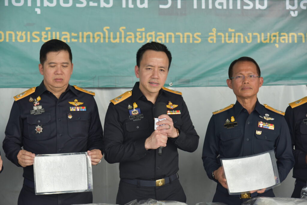 นายพันธ์ทอง ลอยกุลนันท์ รองอธิบดีกรมศุลกากร รักษาการในตำแหน่งที่ปรึกษาด้านการพัฒนาและบริหารการจัดเก็บภาษี นายพงศ์เทพ บัวทรัพย์ รองอธิบดีกรมศุลกากรรักษาการในตำแหน่งที่ปรึกษาด้านพัฒนาระบบควบคุมทางศุลกากร นายถวัลย์ รอดจิตต์ ผู้อำนวยการกองสืบสวนและปราบปราม พ.ต.อ.ณรัชต์พล เลิศรัชตะปภัสร์ ผู้อำนวยการสำนักงานศุลกากรท่าเรือกรุงเทพ และหน่วย SITF โดยนายธัญญาวิทย์ พราวพิจักขณากูล ผู้อำนวยการส่วนสืบสวนทางการเงิน สำนักปราบปรามยาเสพติด (ป.ป.ส.) พ.ต.อ.เส้นชัย ฟู่เจริญ ผกก.3 บก.ปส.1 กองบัญชาการตำรวจปราบปรามยาเสพติด (บช.ปส.) และ พ.อ.มารุต เปล่งขำ ผอ.กอง 12 สปข. ศูนย์รักษาความปลอดภัย กองบัญชาการกองทัพไทย (ศรภ.) ร่วมกันแถลงข่าวการตรวจยึดยาเสพติดให้โทษประเภท 1 ไอซ์ (เมทแอมเฟตามีน) ส่งออกปลายทางฮ่องกง น้ำหนักรวมสิ่งห่อหุ้มประมาณ 51 กิโลกรัม มูลค่ากว่า 30 ล้านบาท ณ ศูนย์เอกซเรย์และเทคโนโลยีศุลกากร สำนักงานศุลกากรท่าเรือกรุงเทพ