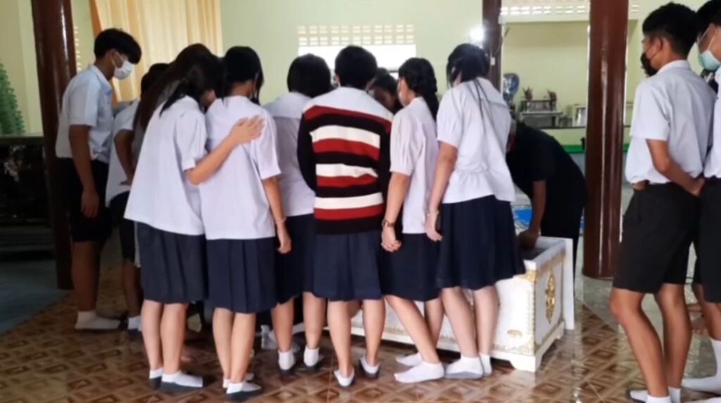 ส่วนที่ศาลา 2 วัดบางพูดใน ต.ปากเกร็ด อ.ปากเกร็ด จ.นนทบุรี พ่อแม่ญาติพี่น้องและเพื่อนร่วมกันทำพิธีฌาปนกิจศพนักเรียนอายุ 15 ปี ที่จบชีวิตตัวเองหลังจากโดนแก๊งมิจฉาชีพหลอกลงทุน โดยมีเพื่อนนักเรียนไปเคาะโรงศพ บอกลาเป็นครั้งสุดท้ายก่อนจะทำพิธีฌาปนกิจ ทาสมกลางความโศกเศร้าเสียใจของญาติพี่น้องและเพื่อนๆ
