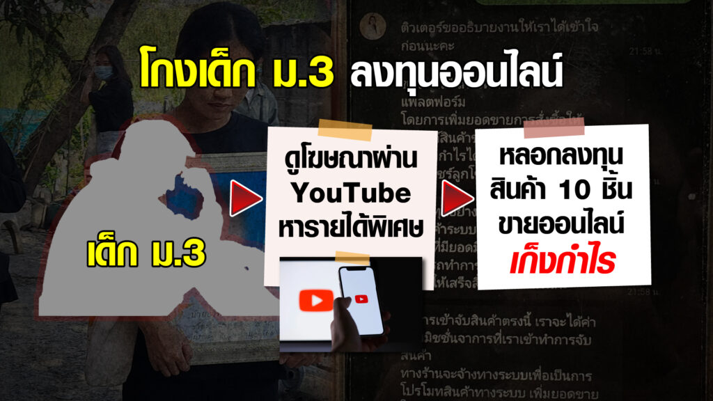 ล่าสุด พล.ต.ต.วิวัฒน์ สั่งการให้เชิญตัว นายรัชชานนท์ อายุ 38 ปี และนายชัยวัฒน์ อายุ 34 ปี ชาวจังหวัดร้อยเอ็ด มาสอบปากคำ หลังทั้งสองราย เชื่อมโยงเส้นเงินของกลุ่มคนร้ายที่ออกอุบายชักชวนให้เด็ก ม.3 ดูโฆษณาผ่าน YouTube เพื่อหารายได้พิเศษ ก่อนหลอกให้ลงทุนซื้อสินค้า 10 ชิ้น วางขายออนไลน์เก็งกำไร โดยอ้างว่าจะได้ผลตอบแทนที่สูงกว่า