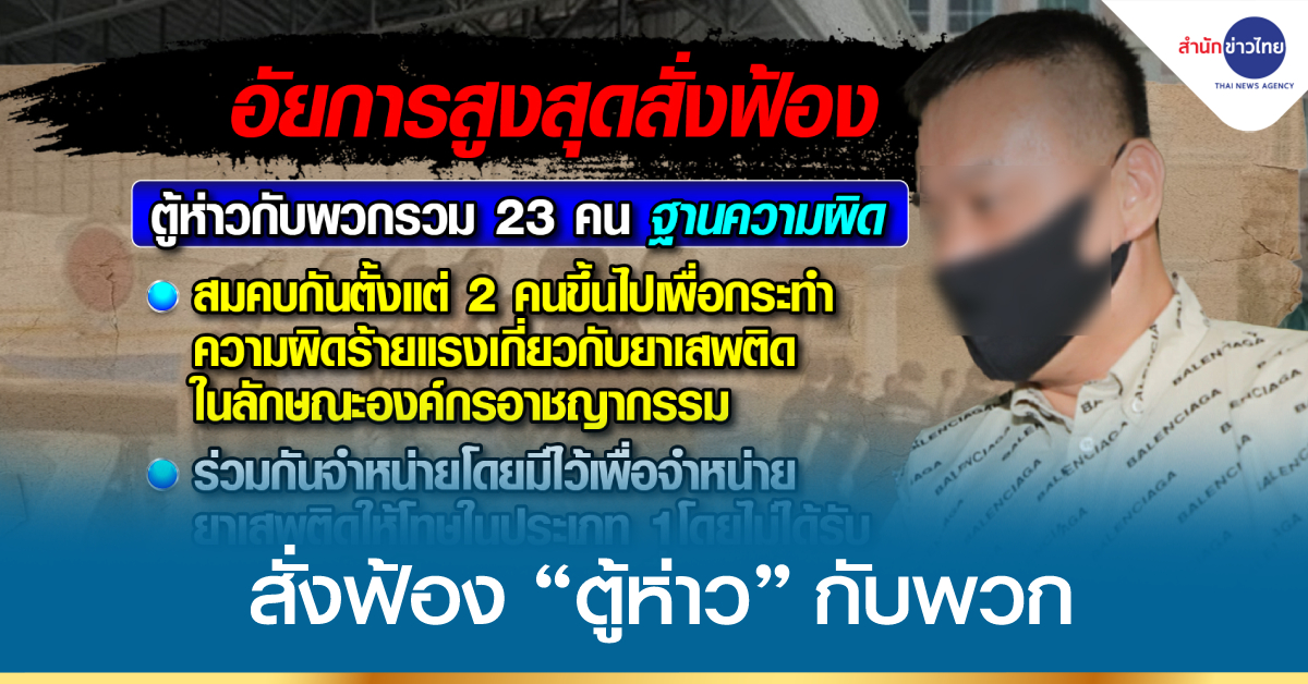 ตามที่สำนักงานอัยการสูงสุดได้รับสำนวนการสอบสวนคดีนายชัยณัฐร์ หรือ ตู้ห่าว กับพวก จากผู้บัญชาการตำรวจแห่งชาติ เมื่อวันที่ 13 มกราคม 2566 และอัยการสูงสุดได้พิจารณาสำนวนการสอบสวนคดีดังกล่าวแล้วนั้น น.ส.นารี ตัณฑเสถียร อัยการสูงสุด ได้มีคำสั่งฟ้องนายตู้ห่าว กับพวก รวม 23 คน ในความผิดฐานสมคบโดยการตกลงกันตั้งแต่สองคนขึ้นไป เพื่อกระทำความผิดร้ายแรงเกี่ยวกับยาเสพติดให้โทษ, ร่วมกันจำหน่ายโดยมีไว้เพื่อจำหน่ายยาเสพติดให้โทษ ในประเภท 1 โดยไม่ได้รับอนุญาต และมีอาวุธปืน ทำให้เกิดผลกระทบต่อความมั่นคงของรัฐ หรือความปลอดภัยของประชาชน, ร่วมกันจำหน่ายโดยมีไว้เพื่อจำหน่ายวัตถุออกฤทธิ์ประเภท 2 และประเภท 4 โดยไม่ได้รับอนุญาต, สมคบโดยการตกลงกันตั้งแต่สองคนขึ้นไป เพื่อกระทำความผิดฐานฟอกเงิน และร่วมกันฟอกเงิน,