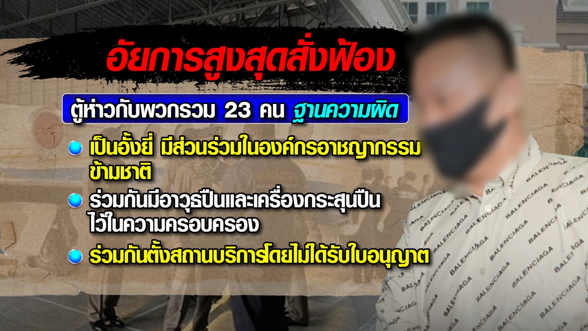 เป็นอั้งยี่ มีส่วนร่วมในองค์กรอาชญากรรมข้ามชาติ โดยสมคบกันตั้งแต่สองคนขึ้นไป เพื่อกระทำความผิดร้ายแรงเกี่ยวกับองค์กรอาชญากรรมข้ามชาติ, ร่วมกันมีอาวุธปืนและเครื่องกระสุนปืนไว้ในความครอบครองโดยไม่ได้รับอนุญาต, ร่วมกันตั้งสถานบริการโดยไม่ได้รับใบอนุญาต, ร่วมกันรับคนต่างด้าวทำงาน โดยคนต่างด้าวไม่มีใบอนุญาตให้ทำงาน และร่วมกันให้เข้าพักอาศัย ซ่อนเร้น หรือช่วยด้วยประการใดๆ ให้คนต่างด้าวที่เข้าเมืองโดยผิดกฎหมายพ้นจากการจับกุม