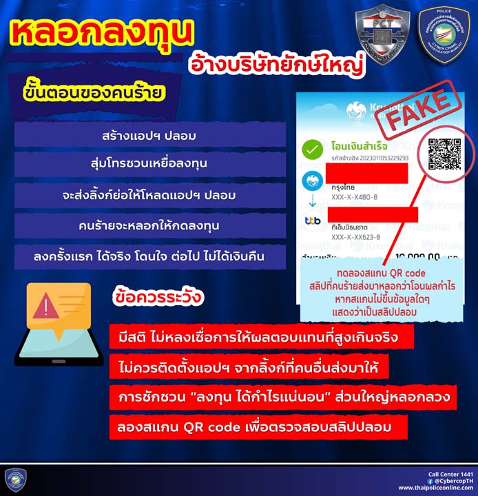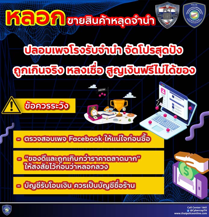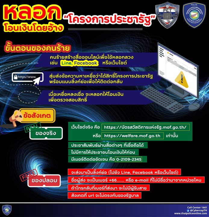 กรุงเทพฯ 26 ม.ค. – ศปอส.ตร.เปิด 4 กลโกงโจรออนไลน์มาแรง เตือนประชาชนระวัง แนะ 3 แนวทางไม่ให้ตกเป็นเหยื่อ อย่าคลิกลิงก์คนไม่รู้จัก อย่ายอมให้ใคร remote เข้าเครื่องได้ และอย่าพิมพ์ PIN หรือรหัสผ่านในมือถือ